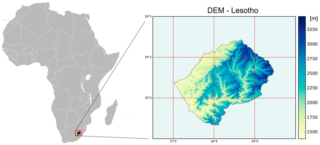 The economy of the Kingdom of Lesotho, located in southern Africa, strongly depends on its water resources for hydro-electricity production, the export of water to South Africa, and for the irrigation of farmland. The mean annual precipitation is 600–800 mm in the lowlands and about 1200 mm in the mountainous areas [1]. Unfortunately, the rain gauge network is sparse, with only about 30 operational, long-term stations, and most of them are located in accessible areas. Consequently, the precipitation rate in the highest mountains (>3000 m above mean sea level (amsl)) is only an approximation. While winter precipitation is much lower, snowfall at higher altitudes can be frequently observed, and the snow remains on the ground for several days or even weeks. The snow water equivalent is not precisely known due to missing measurements in the Highlands, but it is assumed to total more than 100 mm per year [2].