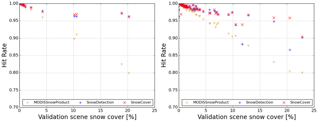 Comparison of MODIS standard snow product (MOD10A1) and the snow product based on MOD09GA data showing the calculated Hit Rate with respect to Landsat (left) and MERIS (right) data. The red x-marks indicate snow detection using NDSI based on MOD09GA data and the blue x-marks stand for the resultant snow cover after temporal and spatial post-processing. For comparison, the quality of the MODIS snow product (MOD10A1) is also shown (brownish x-marks).