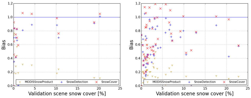 The improved snow product, following the application of the post-processing steps, is clearly shown in Figure 4. The snow product based on MOD09GA underestimates the snow cover by approximately 15% when compared with the Landsat reference data (Figure 4, left); a slightly higher bias is observed when it is compared with the MERIS reference data. Higher bias values are found for lower snow coverages (<5%) of the country. For these situations, only some remaining snow in the mountains is measured and the spatial resolution of the sensor plays an important role to detect snow cover over rough terrain. Consequently, MODIS imagery with 500 m spatial resolution was unable to fully resolve the fine scaled snow distribution in the mountains, especially in comparison to systems with higher spatial resolutions. For comparison, the MODIS standard snow product (MOD10A1) is also shown in Figure 3 and Figure 4 indicating a lower hit rate and a remarkable bias caused by the cloud mask, which miss-classifies snow as cloud.
