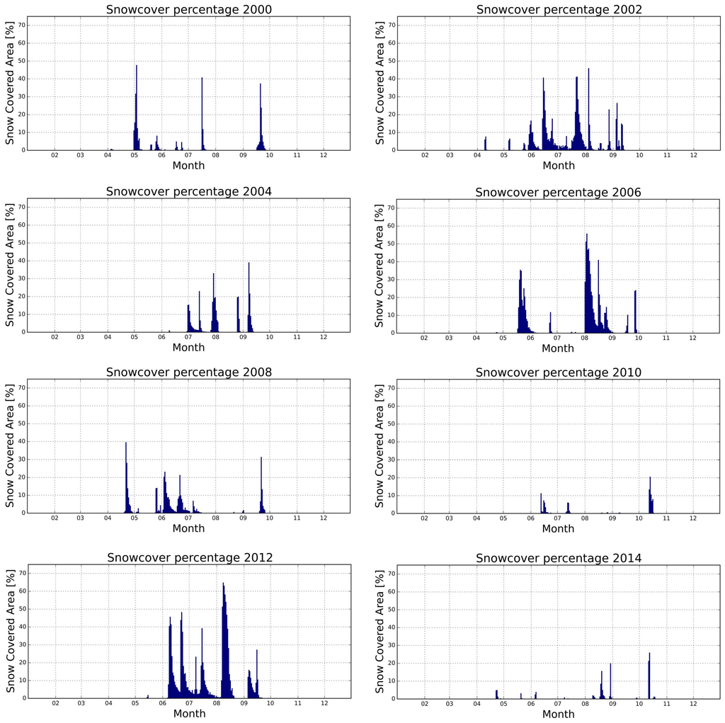 Due to missing ground measurements, only a comparison with the findings of [24] can be discussed. Figure 5 shows that exceptionally low snow cover, which was observed in 2003. Grab and Linde [24] also detected only one snow event in August. The results that were obtained in this study had a temporal resolution of one month. Hence, a daily comparison of the results of the two studies could not be conducted. Snow data retrieval on a daily basis not only describes the snow event during the same observing period (i.e., August in [24]), but could also resolve the occurrence of two snowfall events and the shape of the depletion curve very well. A visual check of the MODIS RGB image and the processed snow map confirms the occurrence of a second snowfall event. In 2007, Grab and Linde [24] reported one snowfall event in May, two in June, three in July and two in August. Our results show that the same amount of snow events occurred in May and August; three snowfall events were detected in June and only one in July. The difference in the number of detected events in June may be attributed to the higher temporal resolution of our data, which enabled the detection of an additional snow event. Visual inspection of the July data did not result in the detection of any additional snow events. This is likely due to cloud misclassification as additional snow cover in the mountainous area.