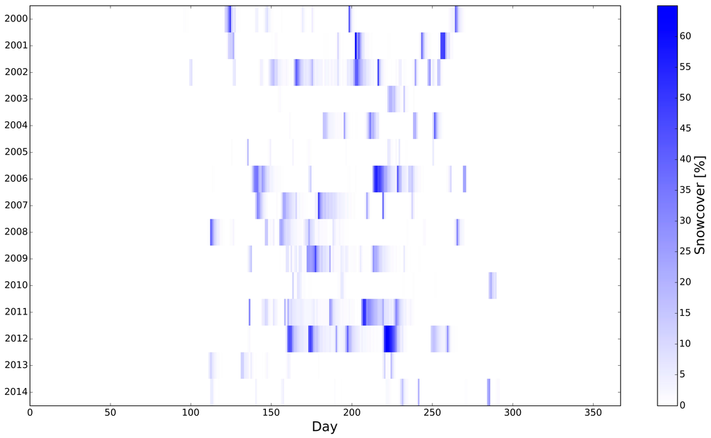 Daily distribution of snow covered area (%) between 2000 and 2014. The dark blue colors represent snow-covered areas that exceed 40% of the total land area; the light blue colors indicate areas in the highest mountain ranges in Lesotho with less than 15% of snow cover.