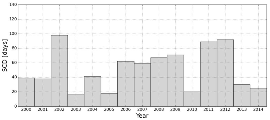 Figure 9 illustrates the high inter-annual variability of snow cover days. A day is counted as a snow cover day whenever the country of Lesotho is covered with snow by more than 0.5% of the area. In 2002, 94 days were snow covered, but in 2005 and 2003, only 14 days were snow covered. On average, 48.9 days per year showed an SCA higher than 0.5% in the study period. It should be noted that most of the pixels that were included in the count were detected in the mountains. This results in high numbers of days with snow cover if the remaining amount of snow is persistent for a longer time due to cold temperatures. This feature is also shown in Figure 10, where more than 100 days of snow cover was observed for an area in Lesotho. The area had between 10% and 20% of snow cover and was located in the mountain ranges. Half of the country is only covered by some days (<10) for the whole period (2000–2015), and a snow covered area of more than 70% was not monitored in the investigated period; a maximum of 64% snow coverage was observed in mid-August 2012. This exceptional snow event in 2012 was also widely covered by the local media, as it caused damage to infrastructure and prevents supply of people in remote valleys. For example, on 16 July 2012, the media reported that 41 people were assessed and treated by emergency staff after encountering particularly heavy snowfall for several hours on their way back from Africa’s only ski resort.
