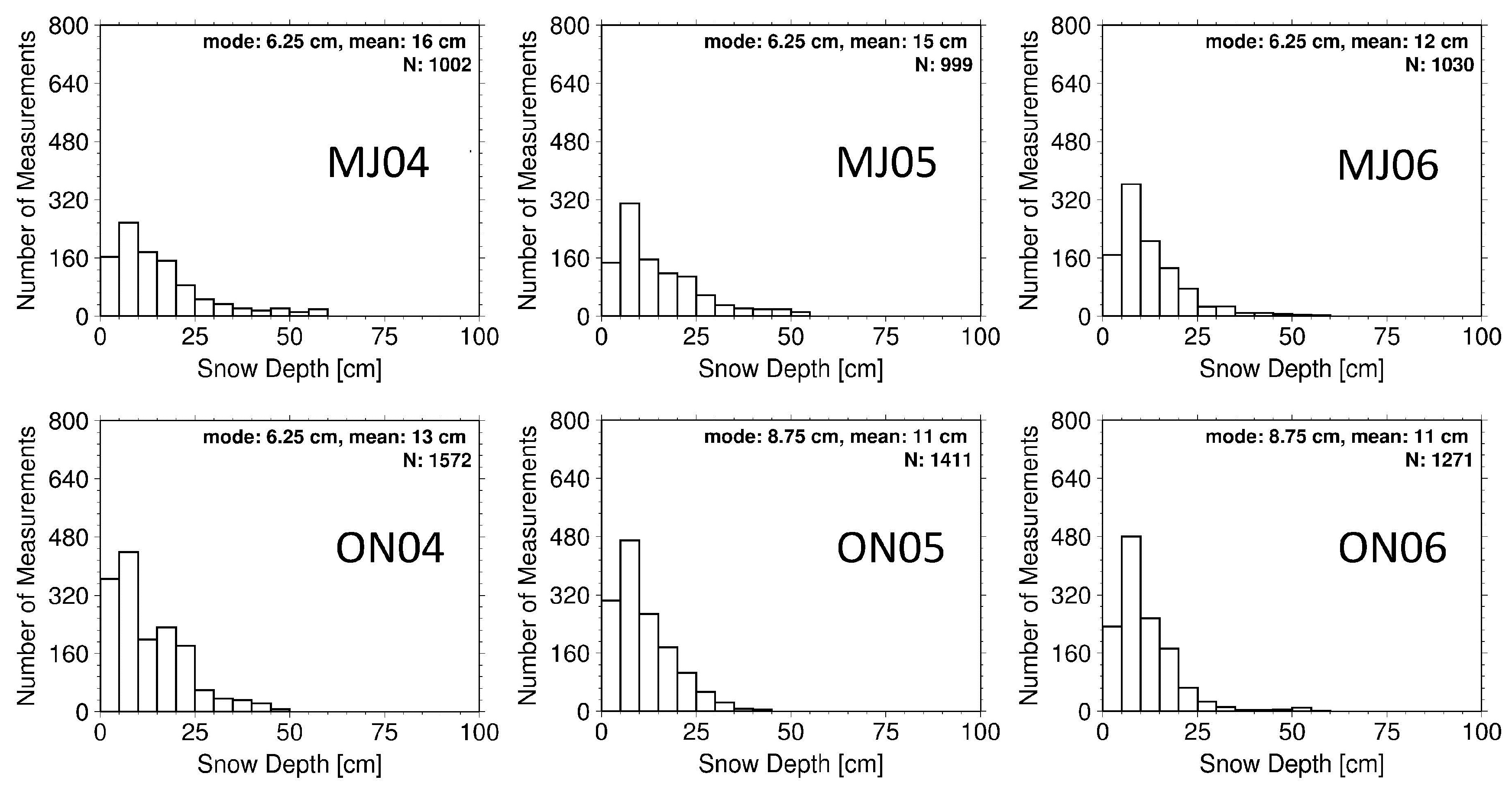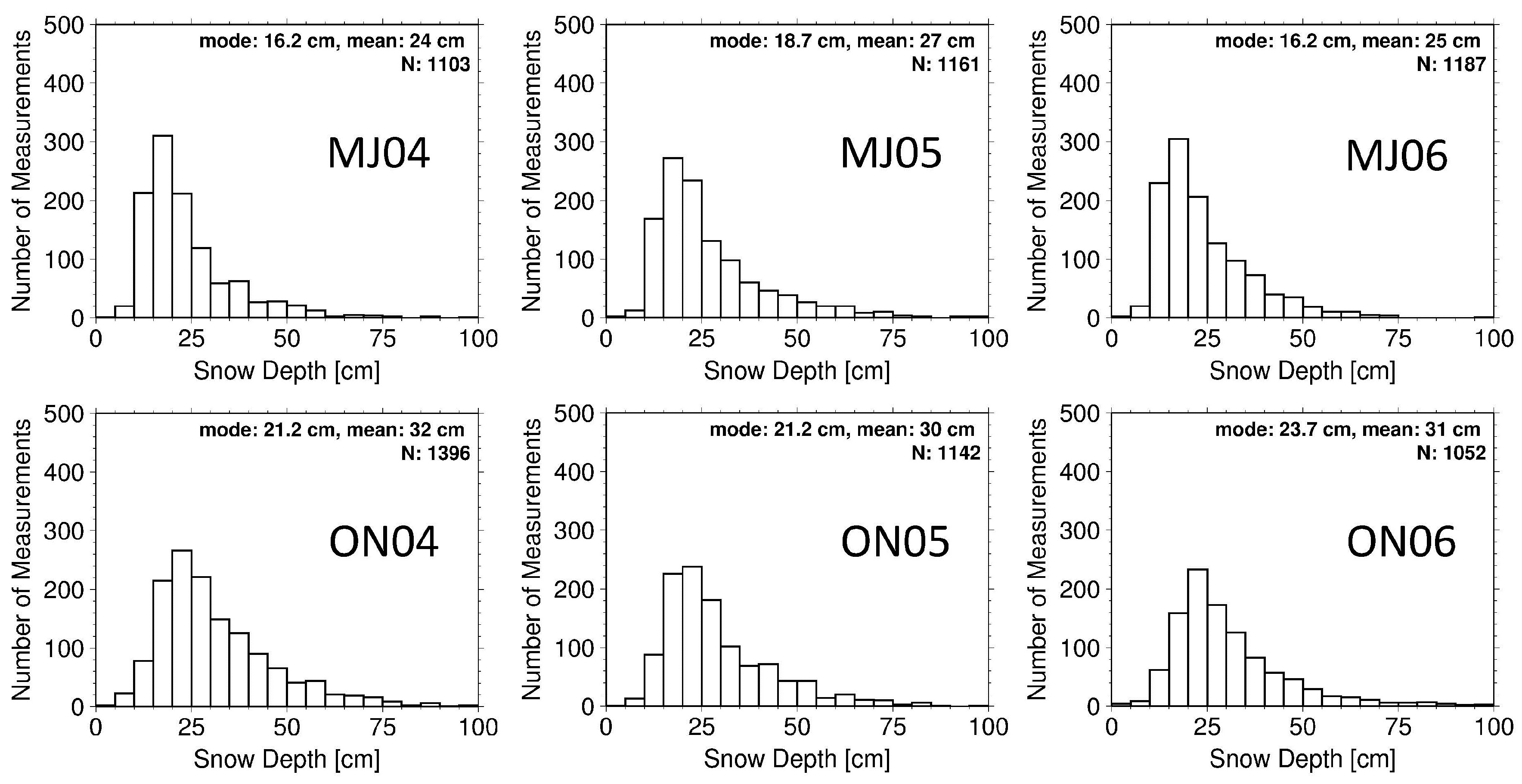 Histograms of the ICESat snow depth for winter: MJ04 to MJ06 (top) and spring: ON04 to ON06 (bottom). Bin size is 5 cm. The modal and mean snow depth is given together with the number of valid data N in the upper right corner of each image.