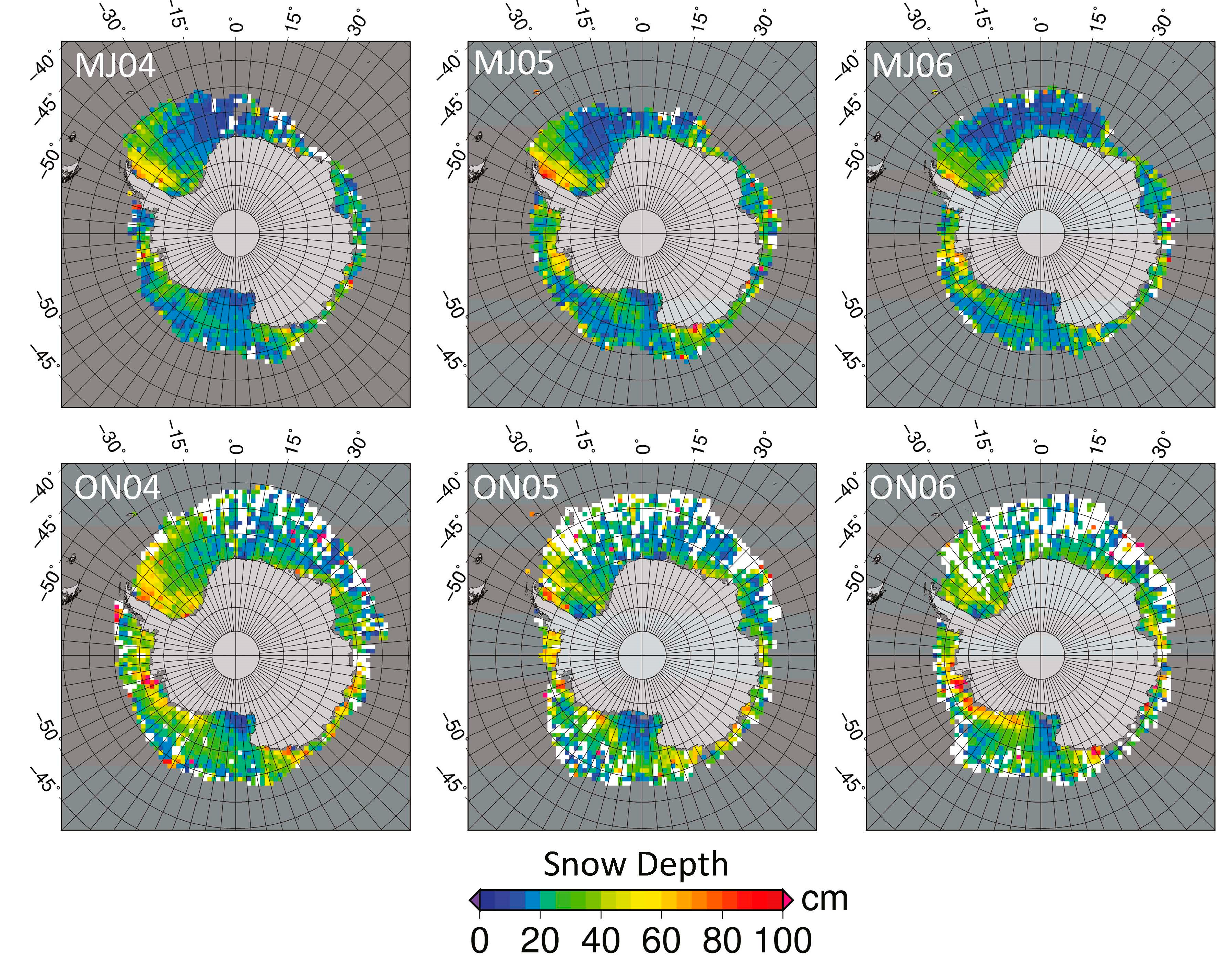 AMSR-E snow depth distribution for winter: MJ04 to MJ06 (top) and spring: ON04 to ON06 (bottom). White areas denote regions with sea ice concentration >60% but <5 days with a valid snow depth. Grid resolution is 100 km.