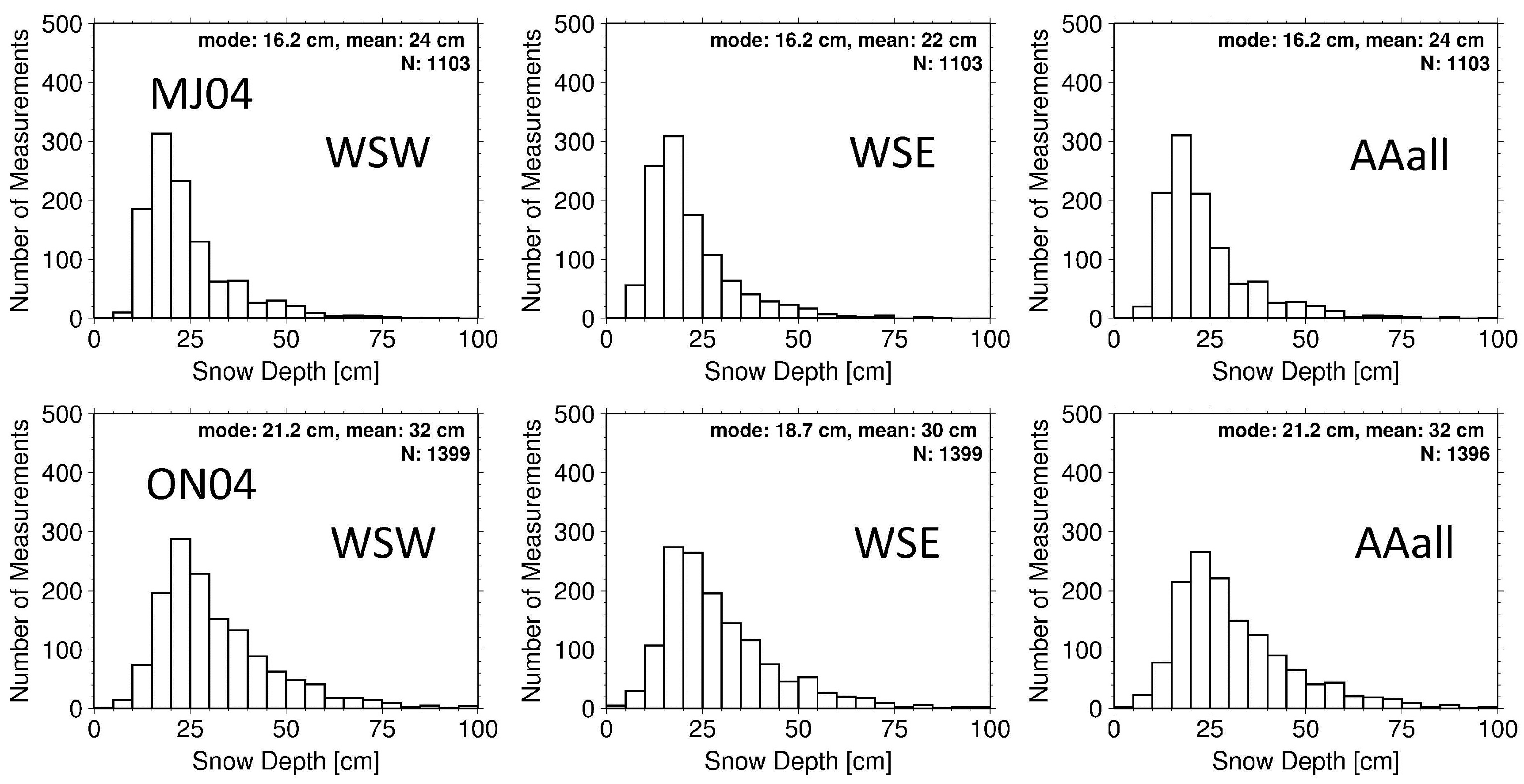 Histograms of the ICESat snow depth derived with different sets of coefficients: WSW, WSE and AAall (see Table 3) for one winter: MJ04 (top) and one spring period: ON04 (bottom). Bin size is 5 cm. The modal and mean snow depth is given together with the number of valid data N in the upper right corner of each image.