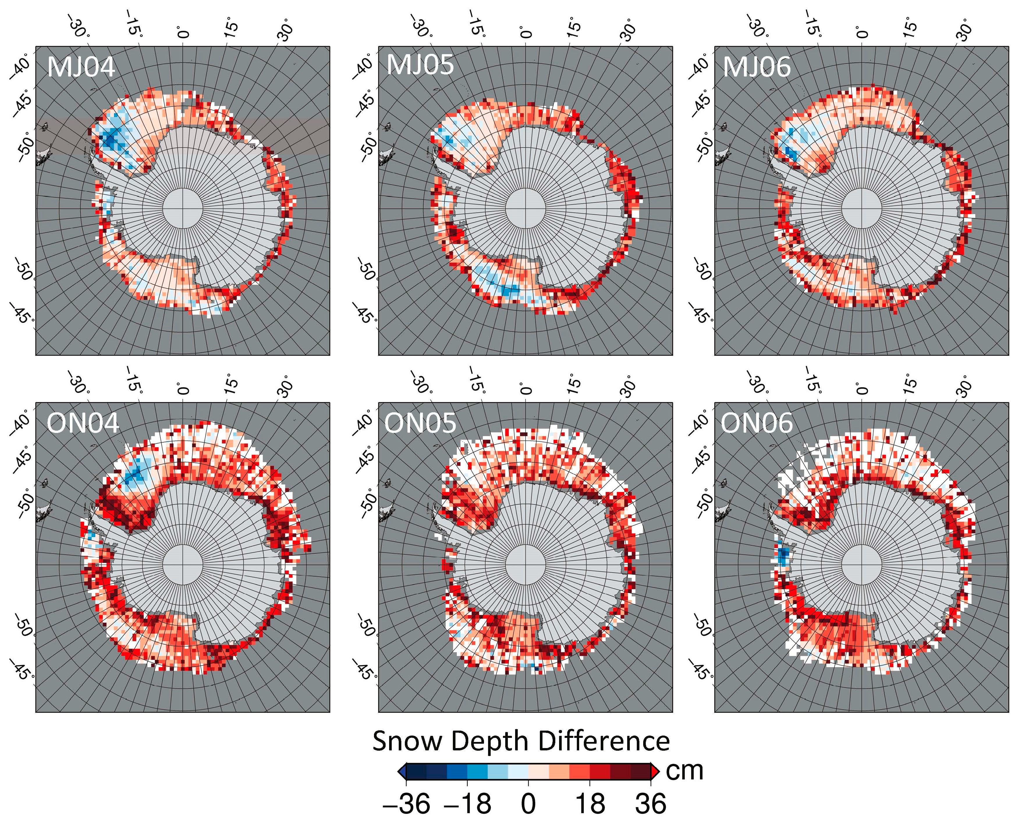The difference maps shown in Figure 7 are dominated by positive values, i.e., ICESat snow depth exceeds AMSR-E snow depth. This applies in particular to spring when differences in the western Weddell Sea and along the coasts are particularly large—except in the Ross Ice Shelf polynya area. In winter, larger areas of differences around zero, i.e., ±6 cm, are only located in the Weddell and Ross Sea (Figure 7, top). In other areas, such as the East Antarctic ice cover, snow depth differences exceed 12 cm already in winter and increase towards spring. Modal values of the difference ICESat snow depth minus AMSR-E snow depth are in bin 5–10 cm in winter and in bin 10–15 cm in spring (Figure 8). This corresponds to an increase in the difference of the average modal snow depths by ~5 cm from winter to spring. Mean values of the difference ICESat snow depth minus AMSR-E snow depth vary in winter between 7 cm (MJ04) and 10 cm (MJ06), and increase towards spring to 15 cm (ON04) and 16 cm (ON06). Differences between mean snow depths increase slightly more than differences between modal snow depths.