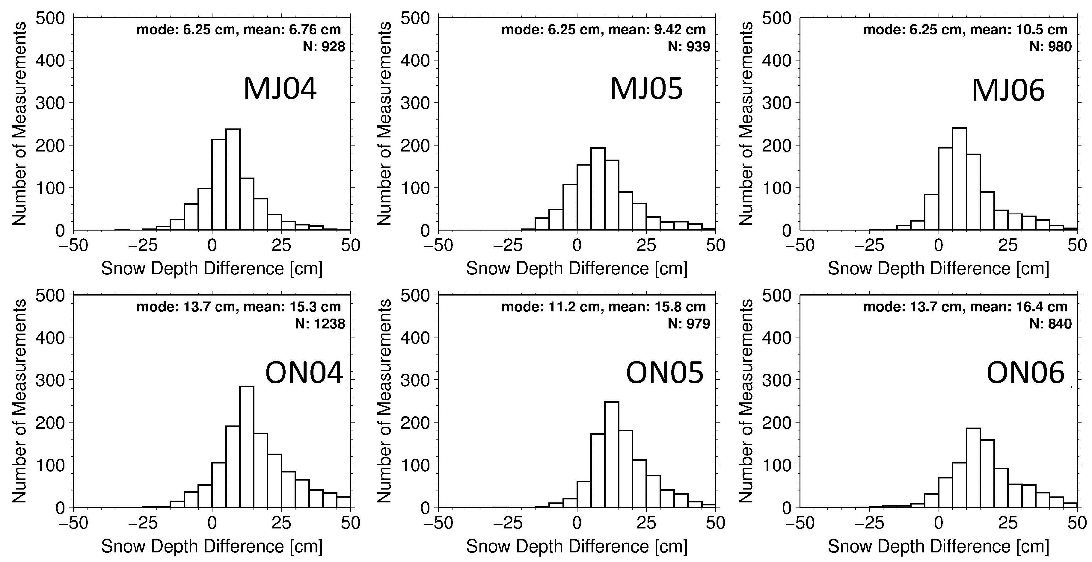 Histograms of the difference ICESat snow depth minus AMSR-E snow depth for winter: MJ04 to MJ06 (top) and spring: ON04 to ON06 (bottom). Bin size is 5 cm. The modal and mean snow depth differences are given together with the number of valid data N in the upper right corner of each image.