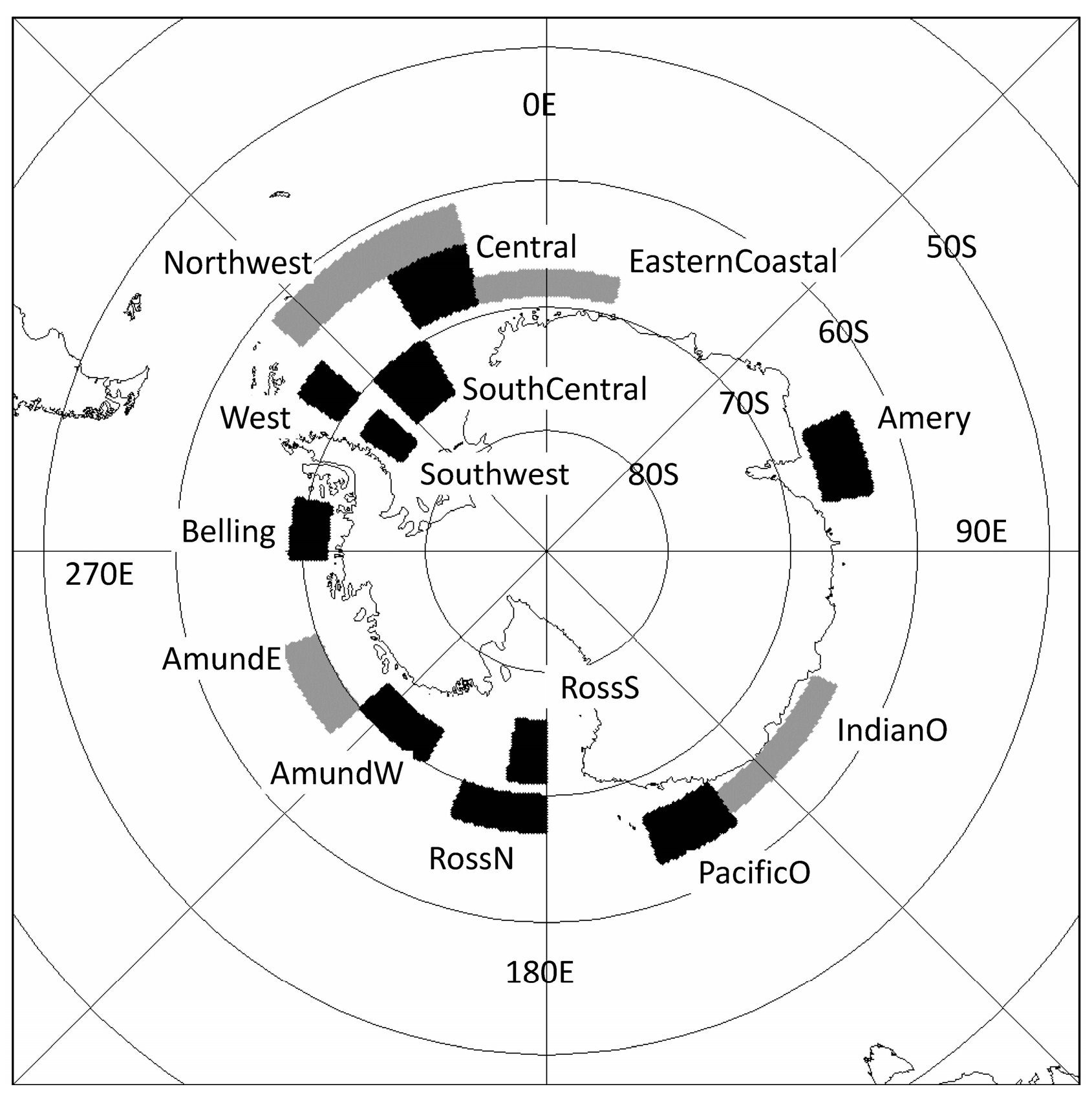Sub-regions selected for the inter-comparison of ICESat and AMSR-E snow depth data with respect to the winter-to-spring snow depth evolution: RossS and RossN: Southern and Northern Ross Sea, respectively; IndianO and PacificO: Indian and Pacific Ocean region, respectively; AmundW and AmundE: Western and Eastern Amundsen Sea, respectively; Belling: Bellingshausen Sea; Amery: Amery Ice Shelf region; all other sub-regions denote a part of the Weddell Sea.