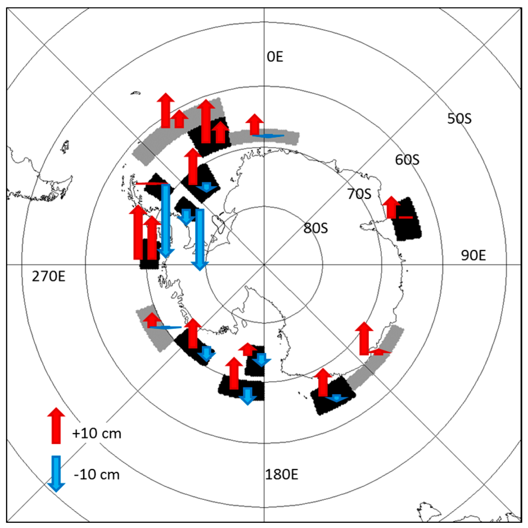 - Lenaerts, J.T.M.; van den Broeke, M.R.; van de Berg, W.J.; van Meijgaard, E.; Kuipers-Munneke, P. A new high-resolution surface mass balance map of Antarctica (1979–2010) based on regional atmospheric climate modeling. Geophys. Res. Lett. 2012, 39, L04501. [Google Scholar] [CrossRef]