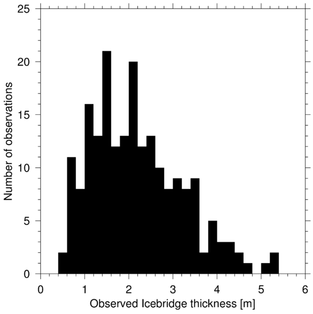 NASA’s Operation IceBridge is an airborne mission that provides an ice thickness product during March and April from 2009 to 2015 [22], with plans for future campaigns in place as well. The IceBridge aircraft has overflown sea ice of varying ages, with numerous flight lines over sea ice in the Western Arctic. The IceBridge Sea Ice Freeboard, Snow Depth, and Thickness L4 Version 1 dataset is available at NSIDC [22]. Thickness in this product is determined by estimating the freeboard using an airborne LIDAR (called the Airborne Topographic Mapper) to deduce the level of the snow-atmosphere interface and a snow radar for the position of the ice/snow interface. Retrieval methods for ice thickness are discussed in [22,23]. The IceBridge ice thickness data has 1 m resolution with ~200 m swath, averaged to give a mean for 40 m segments of the flight line, so that each latitude/longitude point in the data set represents a ~40 m by ~200 m area.