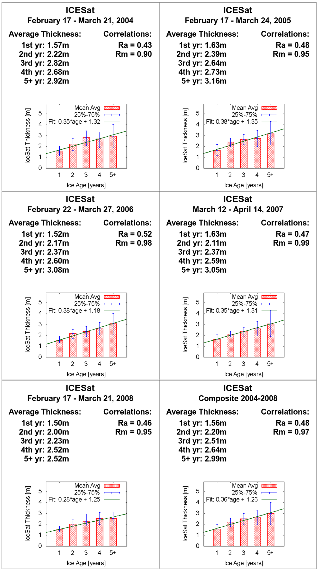 Figure 2 summarizes the mean 2004–2008 ice age/thickness relationship using the ICESat ice thickness dataset [25]. For the entire 2004–2008 period (bottom right), there is a general increase in ice thickness with age of 0.36 m/year, with Rm = 0.97 and Ra = 0.48. First-year ice has a five-year mean thickness of 1.56 m, increasing for each class up to ~3.0 m for fifth-year and older ice. The mean ice thickness for the Arctic over this period was about 2.6 m. We note that 5+ year ice had the same thickness as 4th–year ice during spring 2008, with a mean of 2.52 m for both distributions. This phenomenon was observed in an earlier study [8], which observed that a decline of 0.6 m in the mean sea ice thickness from 2004–2008 was entirely explained by the thinning of thick multiyear ice.