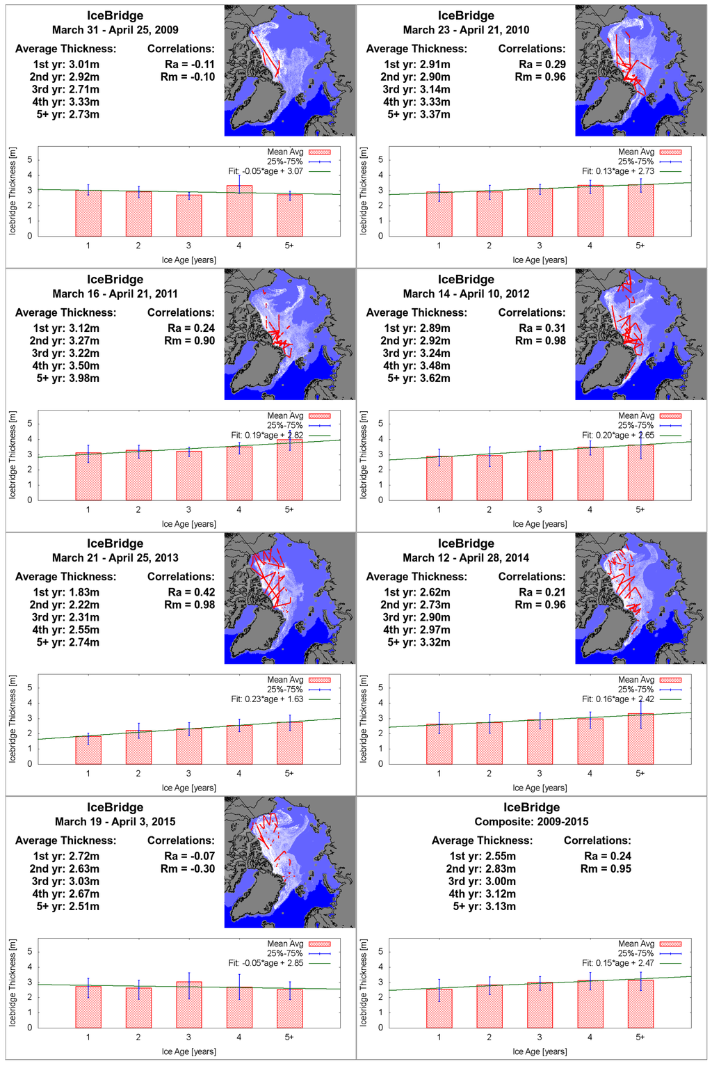 The overall age/thickness relationships for 2009–2015, as well as for individual years, along with the IceBridge flight segments where ice thickness data was computed, are shown in Figure 3. We find a more gradual slope for the age/thickness relationship in the IceBridge data than for ICESat: a 2009–2015 mean 0.15-m/year increase (Rm = 0.95, Ra = 0.24).