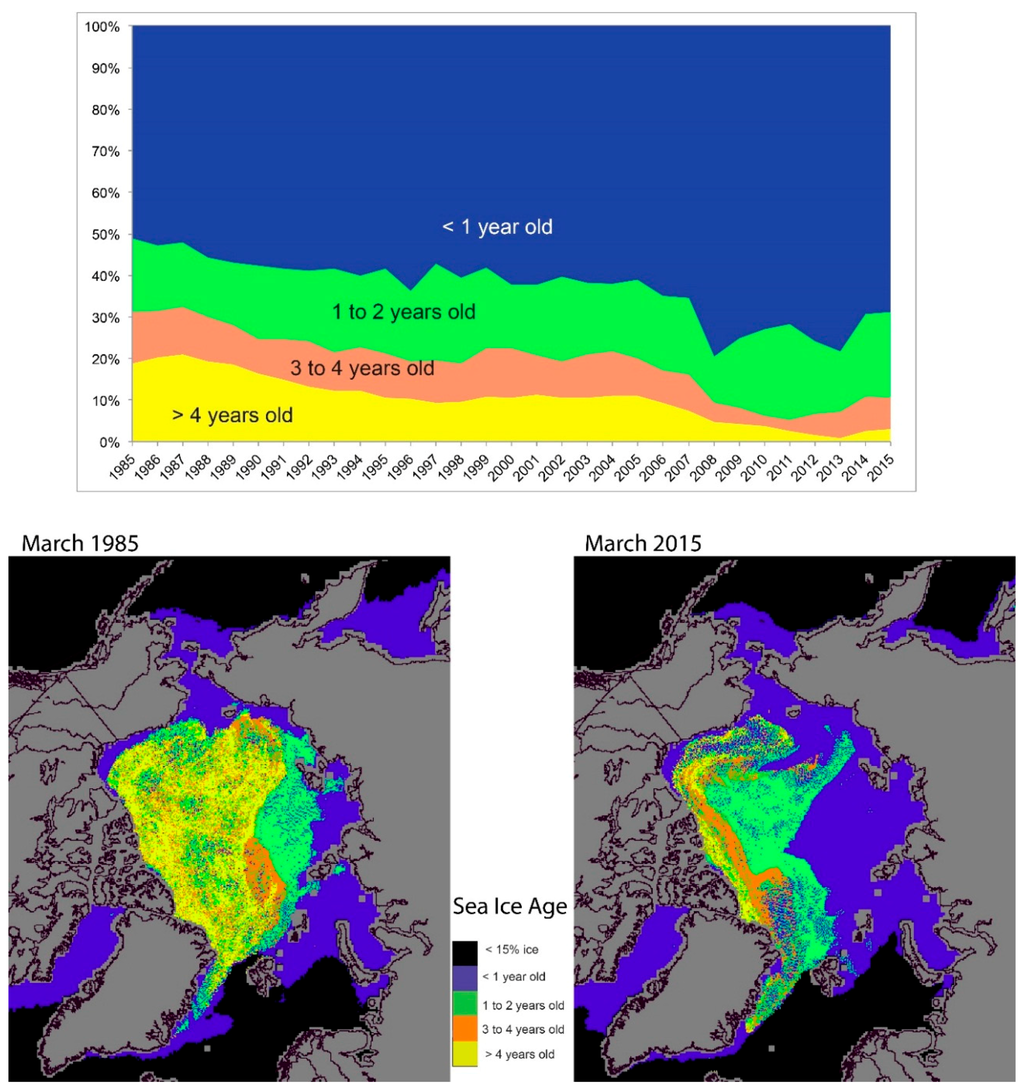 Sea ice age fraction for March 1985–2015 (top), and maps for March 1985 and 2015 (bottom) from the Univ. of CO sea ice age product (NSIDC, 2015). Figure by J. Maslanik, in the sea ice section of the Arctic Report Card, 2015 [30].