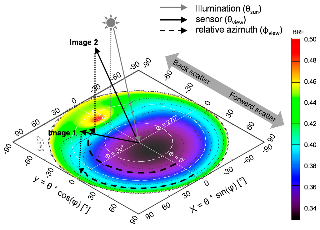 Graphic representation of the geometric relationship between the sun and satellite sensor, relative to the target, for the two image acquisitions: (1) Image 1: φview = 106°, θview = 77° and (2) Image 2: φview = 175°, θview = 57° (BRF field in the figure was generated using [37]).