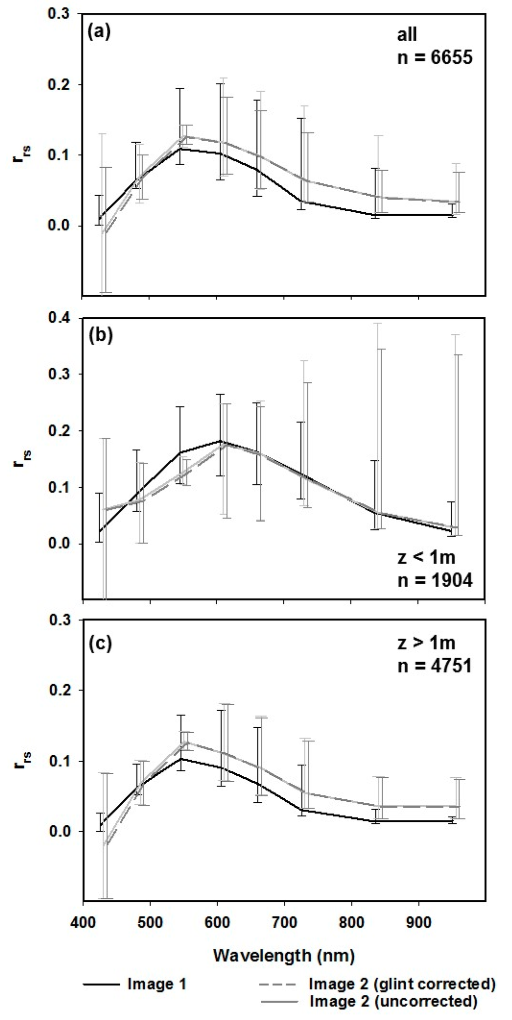 The glint-correction applied to the image did not significantly change the shape of the median spectral response curve of Image 2 as can be seen in the overlap between the two curves in Figure 5. However, the effect of the glint-correction can be observed in the lower 95th percentile rrs in the glint-corrected Image 2, particularly when all the data points are considered (Figure 5a) and in optically shallow water (Figure 5b).