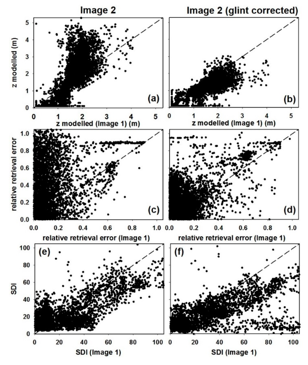 Relative comparison of depth retrieval: scatterplot of the model-estimated depth retrieved from Image 1 versus model–estimated depth retrieved from (a) Image 2 and (b) Image 2 after glint correction (dashed line represents 1:1 relationship). Scatterplot of absolute relative depth errors (), retrieved from Image 1 versus absolute relative depth errors retrieved from (c) Image 2 and (d) Image 2 after glint correction. Scatterplot of SDI retrieved from Image 1 versus SDI retrieved from (e) Image 2 and (f) Image 2 after glint correction.
