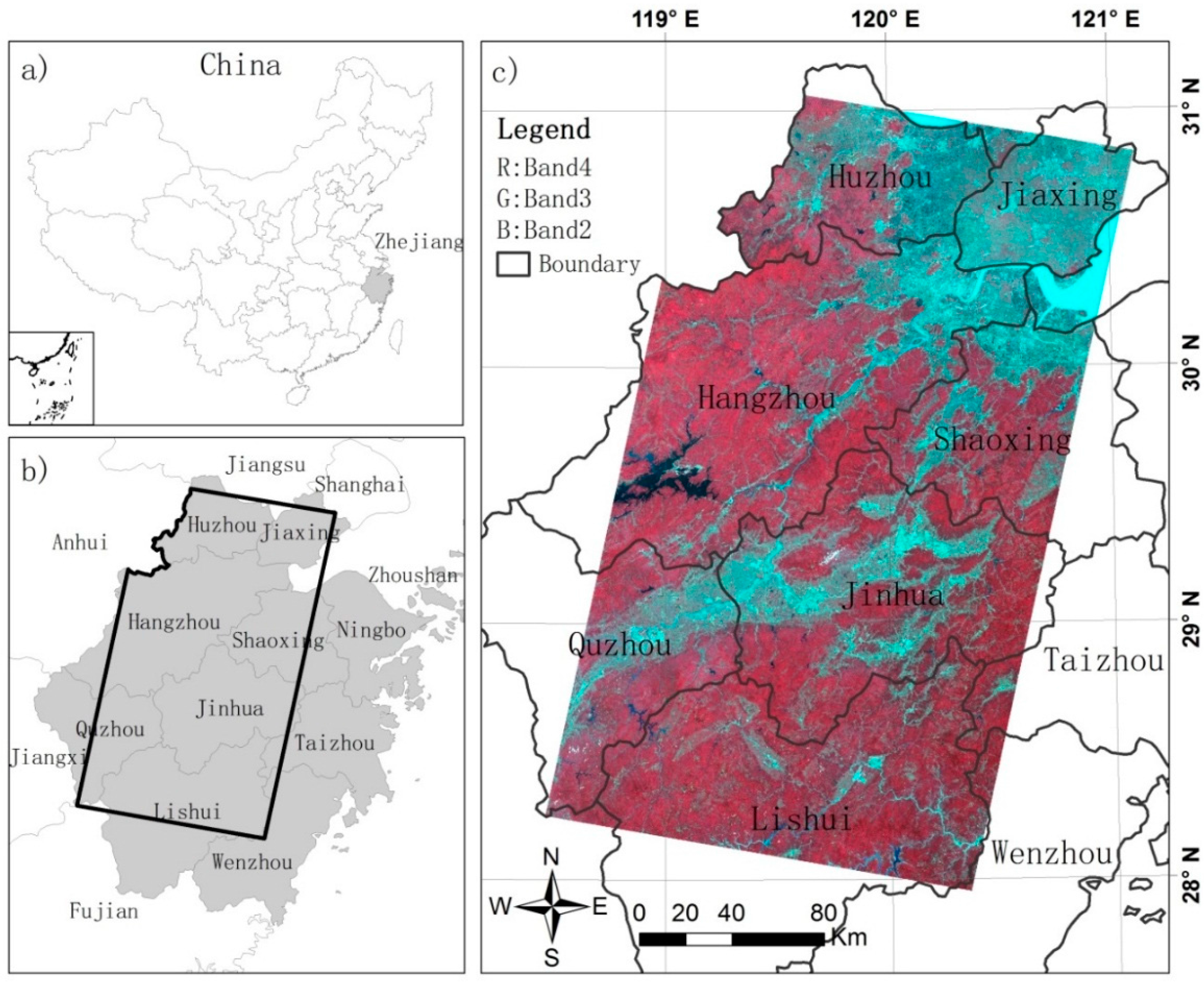 Location of study area—partial Zhejiang Province, eastern China (Note: (a) the study area is located in Eastern China; (b) the study area occupies most part of Zhejiang province; and (c) a false color composite of Landsat Thematic Mapper (TM) band 4 in red, band 3 in green, and band 2 in blue, highlighting vegetated areas in red color).
