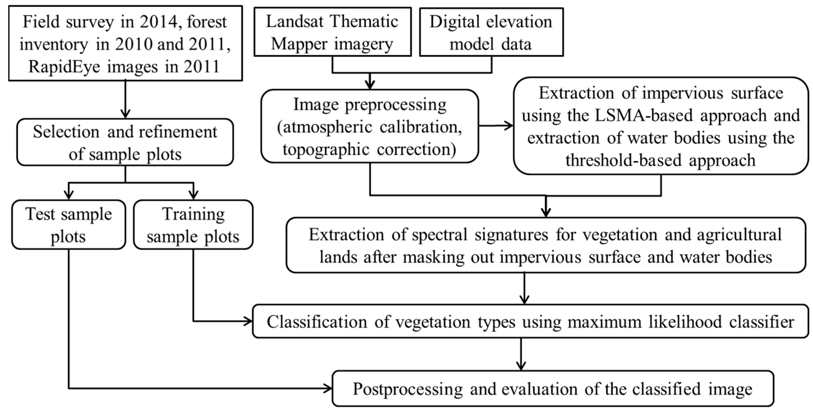 Table 4 provides the definitions of each vegetation type based in the forest inventory data. In order to conduct supervised classification, selection of sufficient numbers of representative sample plots is critical. In this research, three datasets—field survey data collected in 2014, forest inventory plot data collected in 2010 and 2011, and RapidEye images acquired in 2011—were used to select sample plots for this classification. Separability analysis of the vegetation classes was conducted using the transformed divergence algorithm [47]. Refinement of training sample plots for each class was conducted based on the analysis of spectral curves of sample plots for each vegetation type. Approximately 50% of the sample plots were used as training samples and the remaining sample plots were used for accuracy assessment of classification. Figure 2 illustrates the framework of mapping vegetation distribution using Landsat 5 TM imagery in this study area, including (1) preparation of training and test sample plots; (2) image preprocessing and extraction of non-vegetation classes (e.g., impervious surface area (ISA) and water bodies); (3) extraction of spectral signatures for vegetation types; (4) vegetation classification using maximum likelihood classifier (MLC); (5) evaluation of classification result.