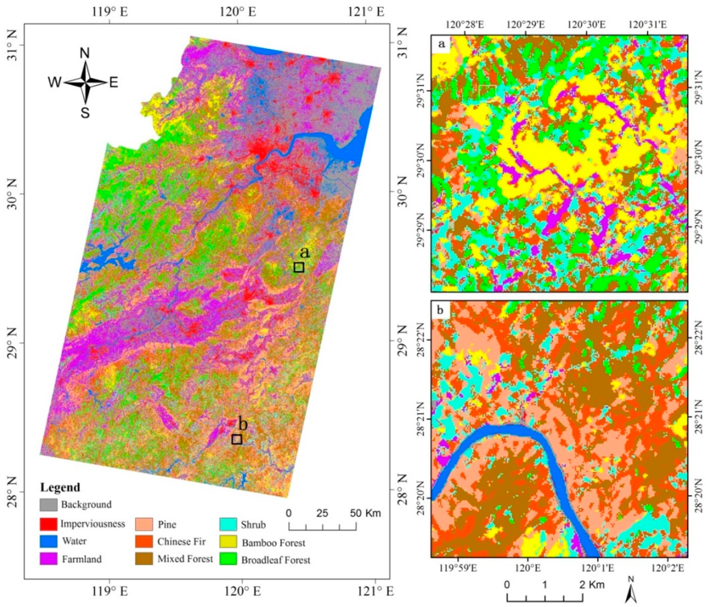 Figure 3 illustrates the classification result. Broadleaf forests dominated the western part of the study area and were scattered in the central, southern, and southeastern parts. Pine, fir, and mixed forests were mainly distributed in the southern and southeastern parts. Farmlands and built-up areas were mainly distributed in the northern and northeastern flat area and the belt from the central to the southwestern parts called Jin-Ju basin. This vegetation classification result was used in the mapping of AGB distribution through the established AGB estimation models based on the stratification of vegetation types.