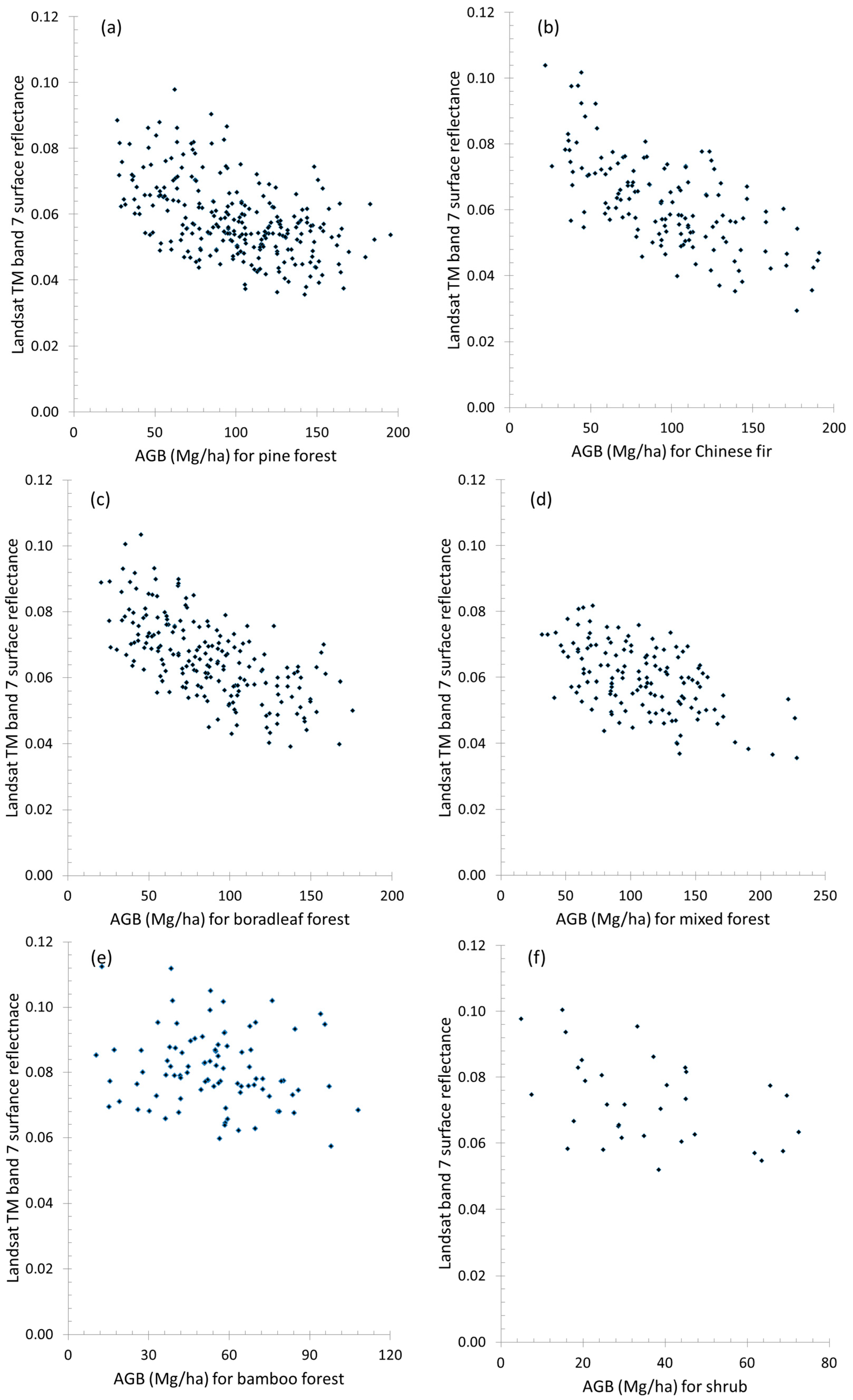 The relationships between aboveground biomass (AGB) and Landsat 5 Thematic Mapper (TM) spectral band 7 surface reflectance for different vegetation types: (a) pine forest; (b) Chinese fir; (c) broadleaf forest; (d) mixed forest; (e) bamboo forest; and (f) shrub.