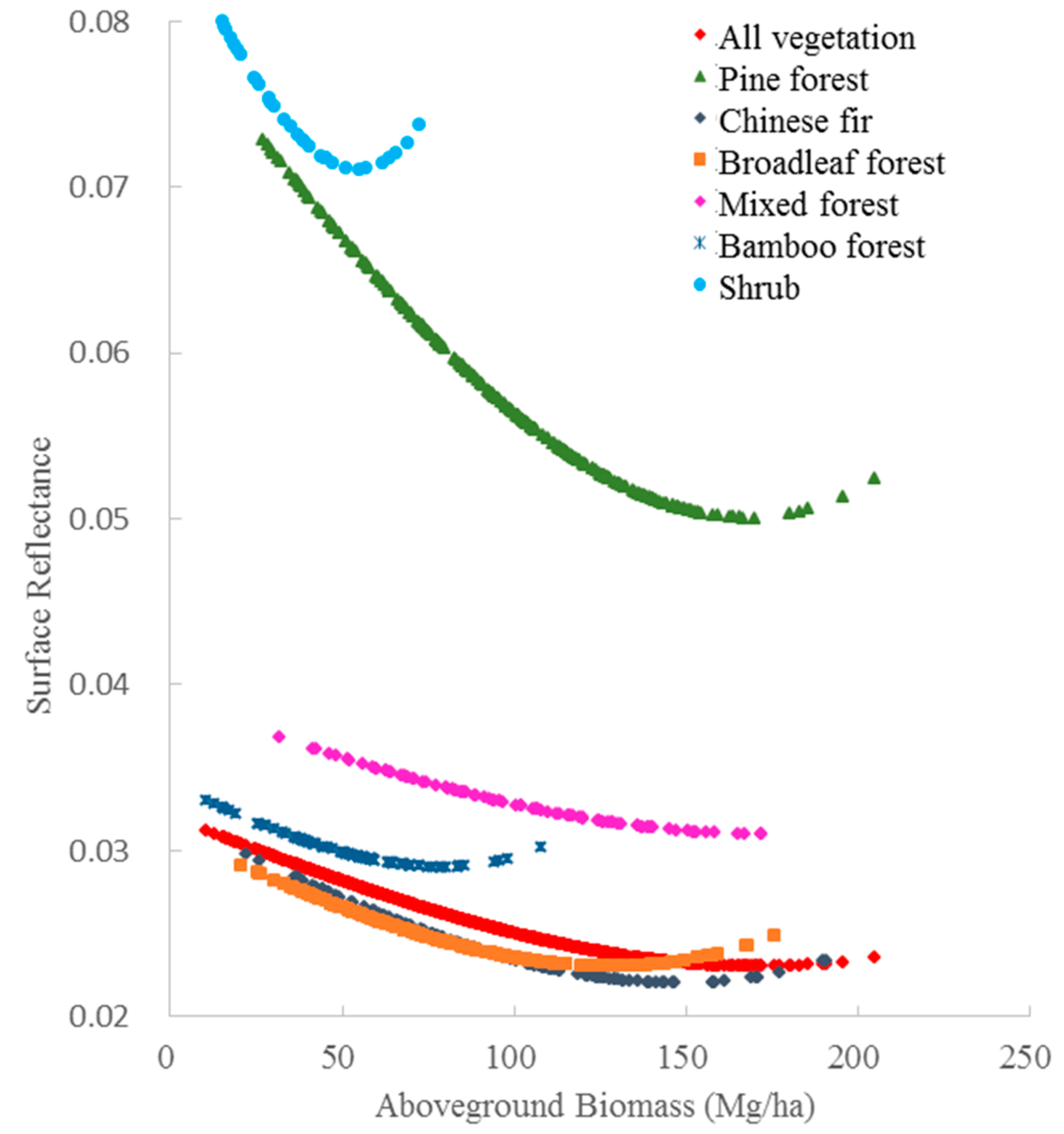 The correlation analysis in Table 6 revealed that the SWIR2 (i.e., spectral band 7 in Landsat 5 TM imagery) had the strongest negative correlation coefficient with AGB for the All-vegetation category and for specific vegetation types except mixed forest. Thus, band 7 was used to analyze AGB saturation values for the vegetation types. The scatterplots in Figure 4 show that vegetation types except bamboo forest have similar trends; that is, the surface reflectance values of band 7 decreased and eventually became stable as AGB increased. The shrub has a relatively weak trend and bamboo forest lacks this trend. The value of AGB at which the value of band 7 became stable can be regarded as the saturation value.