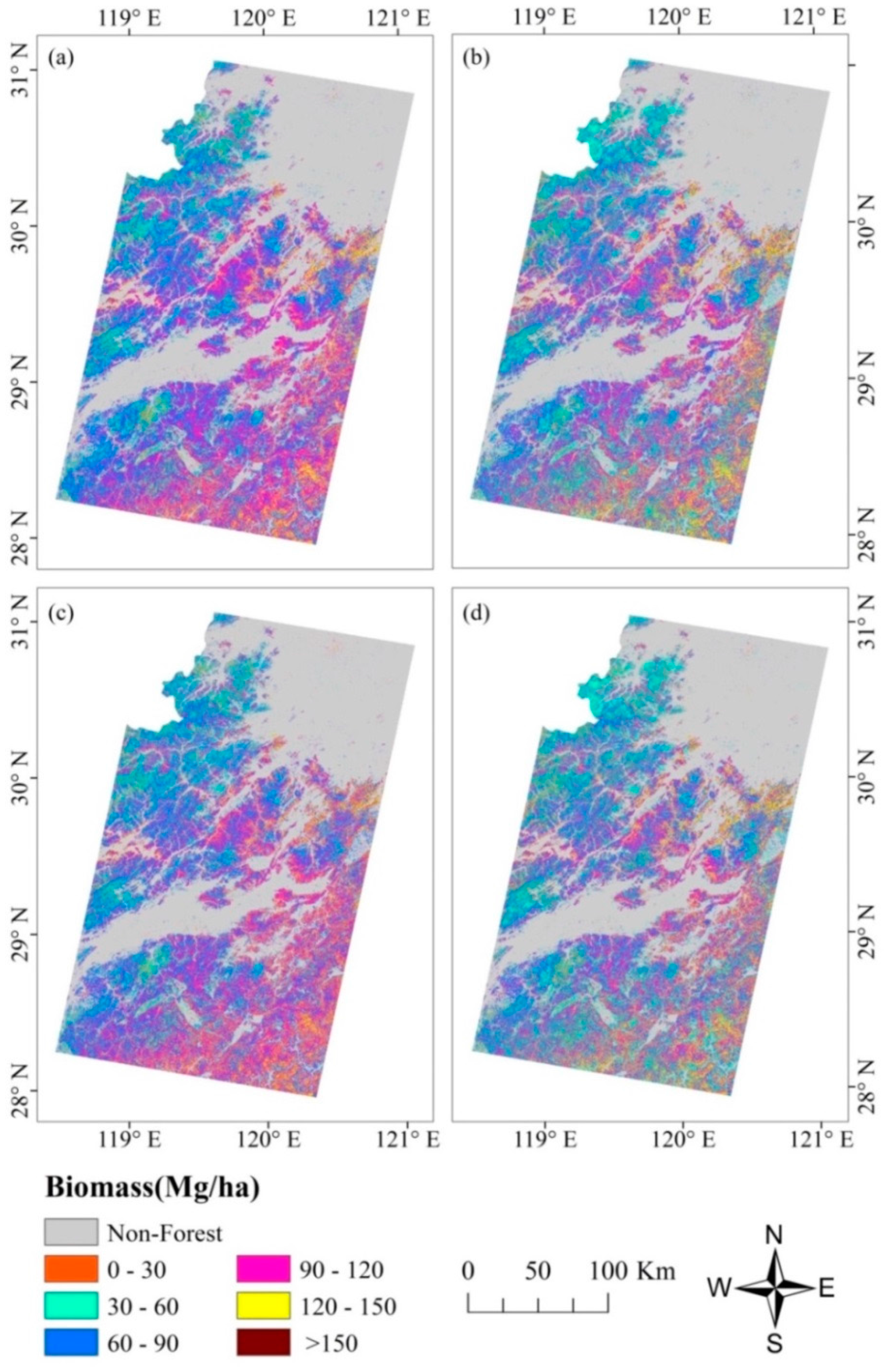 Forests taking carbon dioxide from the atmosphere and accumulating biomass through photosynthesis are an important carbon sink of terrestrial ecosystems. Estimating and mapping forest biomass/carbon stocks become essential for greenhouse gas inventories, global carbon cycle, and climate change modeling [1,2,3]. Various methods such as process models and remote sensing-based approaches have been developed and used [4,5,6,7]. The process models-based methods do not generate spatially explicit predictions and often lead to a large amount of uncertainty for specific sites, partly because too many variables and input parameters are required to run the models and partly because different source data such as climate and soil data have very coarse spatial resolutions [8,9,10]. In contrast, remote sensing-based approaches have become popular due to their unique characteristics in data collection and presentation; that is, multitemporal remote sensing images not only reveal spatial variability, spatial distributions, and patterns of forests but also provide the potential to estimate their changes over time [4,5,6,7]. A large number of research papers on biomass estimation using remote sensing data have been published in the past three decades, as summarized in previous literature review papers (e.g., [4,6,11,12,13,14,15,16,17]).