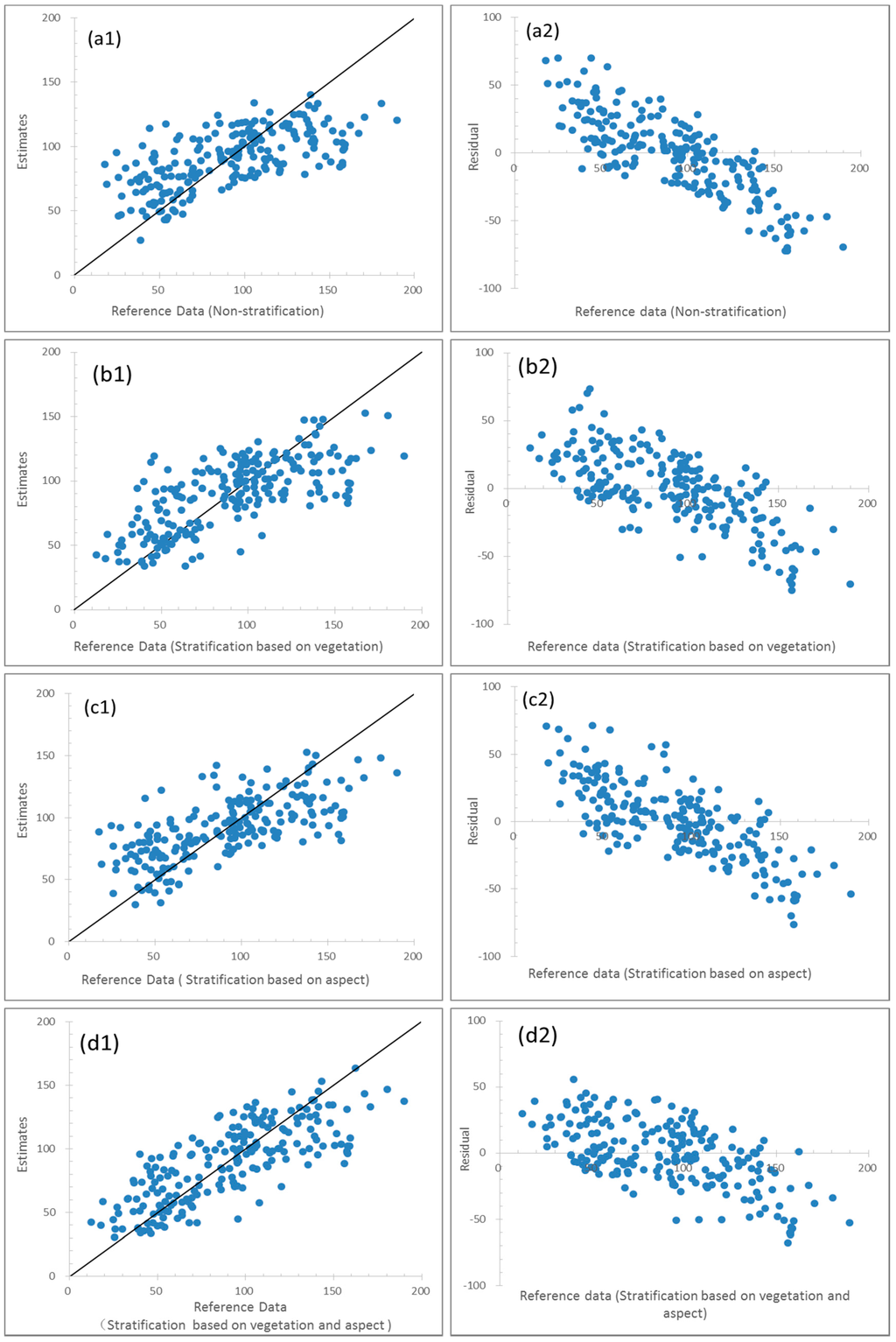 Figure 7 provides a comparison of the relationships between the AGB estimates and corresponding AGB reference data, and their residuals of four AGB maps derived using the models from four scenarios: non-stratification, stratification based on vegetation types, stratification based on slope aspects and stratification based on the combination of vegetation types and slope aspects. Overall, the linear relationship between estimates and reference data for each scenario is obvious, implying the capability of using Landsat TM images in AGB estimation. However, overestimations and underestimations occurred for the smaller and greater AGB observations, respectively, especially when AGB was less than approximately 40 Mg/ha and greater than approximately 150 Mg/ha. This over/underestimation problem was slightly improved by stratification approaches, especially the stratification based on both vegetation types and slope aspects (d1 and d2 in Figure 7), implying the important role of stratification in reducing AGB estimation errors.