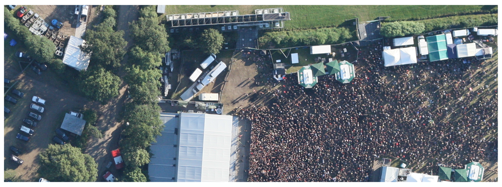 For obvious reasons, terrestrial cameras can be installed more easily but might not always be sufficient while monitoring large events (e.g., street festivals, open-air concerts). In complex scenarios, terrestrial cameras cannot always provide all necessary visual information due to their limited field of view and limited availability, for example, terrestrial cameras cannot be mounted at every possible location. Low flying platforms like helicopters or small drones could help, but these are either very loud or not well accepted in public.