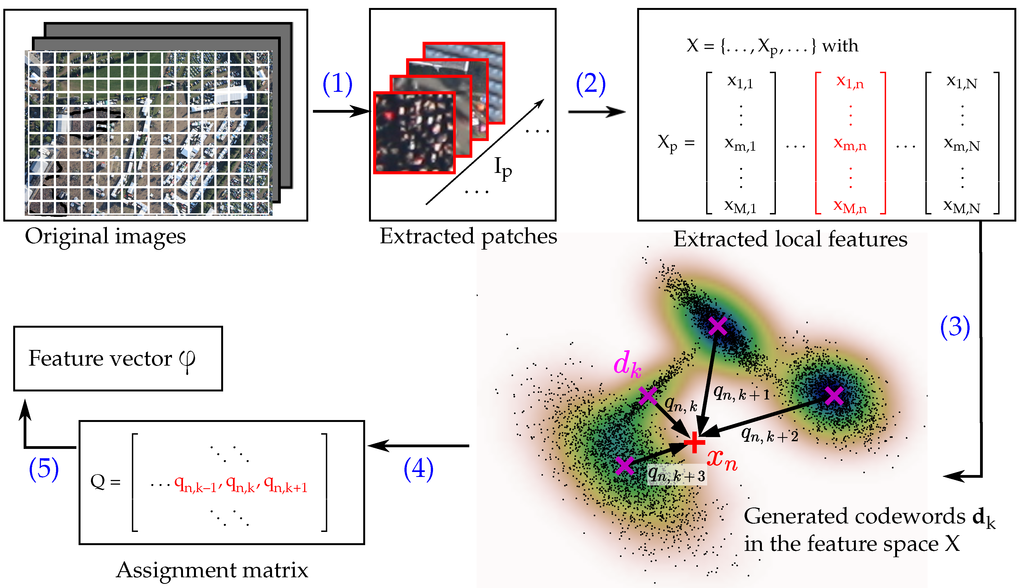 The Bag-of-Words (BoW) workflow applied on aerial images for crowd detection with the main processing steps: (1) patch sampling; (2) local feature extraction; (3) codewords generation; (4) feature encoding; (5) feature pooling.