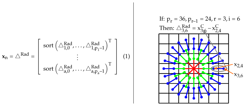 The SRP method extracts small subpatches in a sliding-window manner. Within each of these subpatches, rotation invariance is achieved through a sorting of pixel values by their intensity. From each subpatch, exactly one local feature vector is calculated. The sorting within a subpatch can be performed on different neighborhood structures around the center pixel . According to the performance evaluation in [27], we consider the proposed radial-diff neighborhood. This sorting scheme calculates the difference of two pixel values. The first lies on a concentric circle around the center pixel of the patch, and the second lies on the neighboring inner circle (see Figure 3). Formally, this radial difference is described in Equation (1).