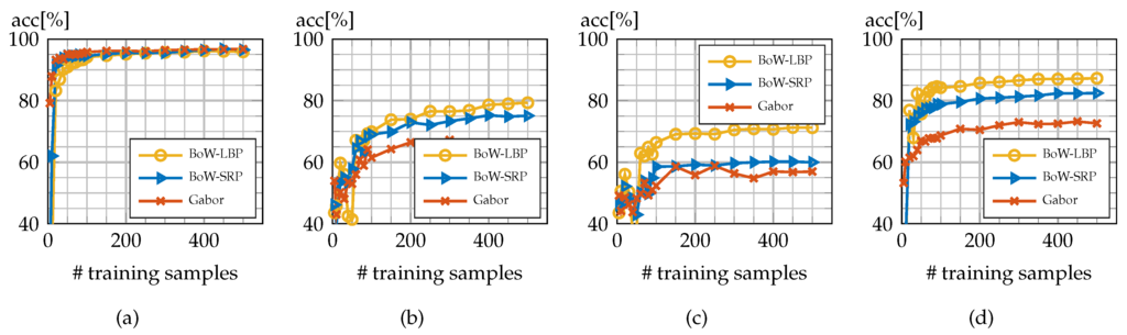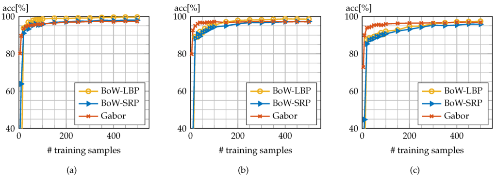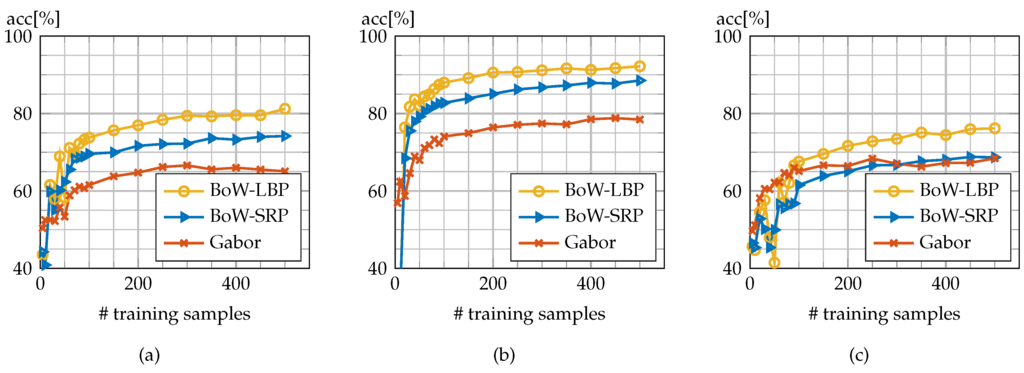 Interestingly, the Gabor features need less training samples than the BoW features when they are tested on class 4 samples (Figure 8a–c). The Gabor’s accuracy converges more quickly, but on the same level as the BoW features.