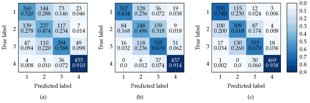 Confusion matrices for the four-class classifications with Gabor, BoW–SRP, and BoW–LBP features (# train samples = 440, # test samples = 2000). The samples have been selected randomly from the whole database. The labels correspond to the classes shown in Figure 6. (a) Gabor features; (b) BoW–SRP features; (c) BoW–LBP features.