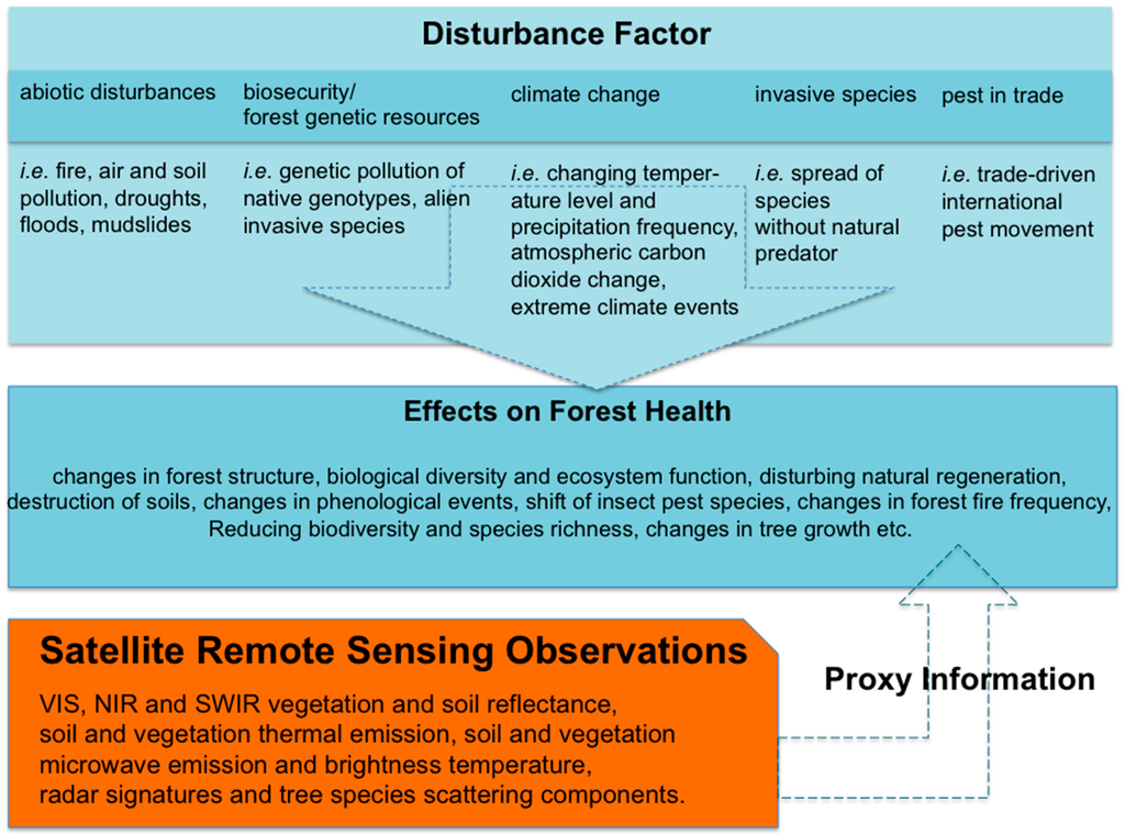 The development of sustainable strategies for national and international forest management has increased the demand for spatially explicit information at various geographic and management levels. Annual area-based estimations of carbon sequestration in forest biomass, dead organic matter and soil organic carbon are still quite uncertain for European forests, because they are largely based on change rate estimations [2]. Here satellite imaging remote sensing technologies from national, European and global Earth observation programs can provide data for the large-scale monitoring of forest ecosystems to study the causal relationships of disturbance factors across spatial scales and understand relevant feedback processes i.e., between soil, vegetation and the atmosphere [3,4,5]. Our review focuses on biotic and abiotic disturbances (i.e., drought stress, pest infestation and environmental pollutants) in European forest inventory that are of special interest for the implementation of an area-based forest monitoring on a regular basis supported by satellite remote sensing observations. The review is designed to bridge gaps of understanding between forestry and remote sensing science community by presenting state-of-the-art information on methods to the two user groups relevant for in situ/remote-sensing integration and necessary to enhance the application value of remote sensing data for the assessment of forest health.