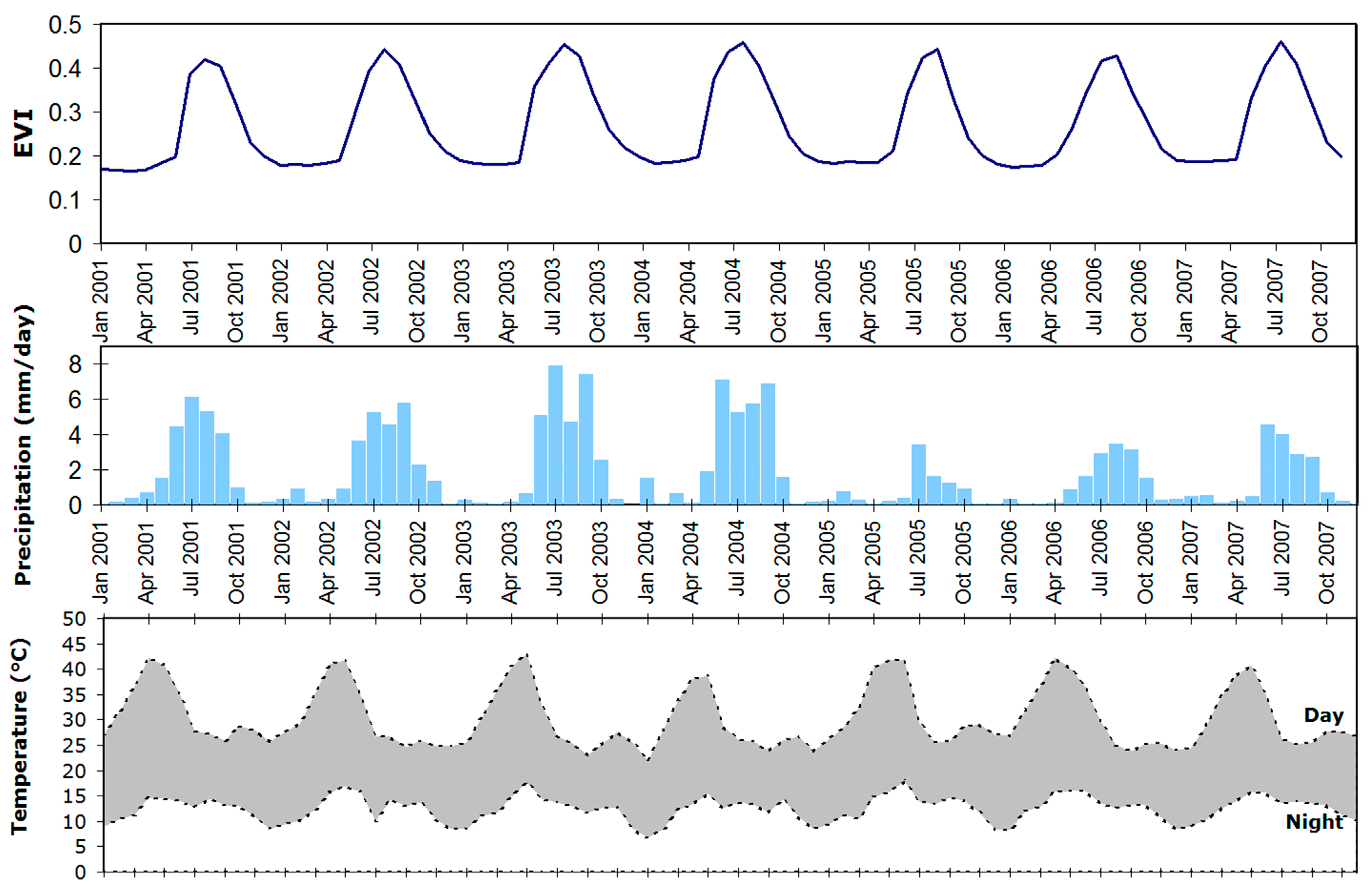 Enhanced Vegetation Index (EVI) image composites produced by MODIS product MOD13A3 were used for this study. This product is a monthly maximum value composite of observations from the MODIS instrument on the Terra platform, with a spatial resolution of 1 km per pixel and continuous coverage over the period of study, 2001–2007. As this imagery has undergone geometric correction and compositing by the producers to accommodate periods of impaired observations [61], no further correction was performed in this study.