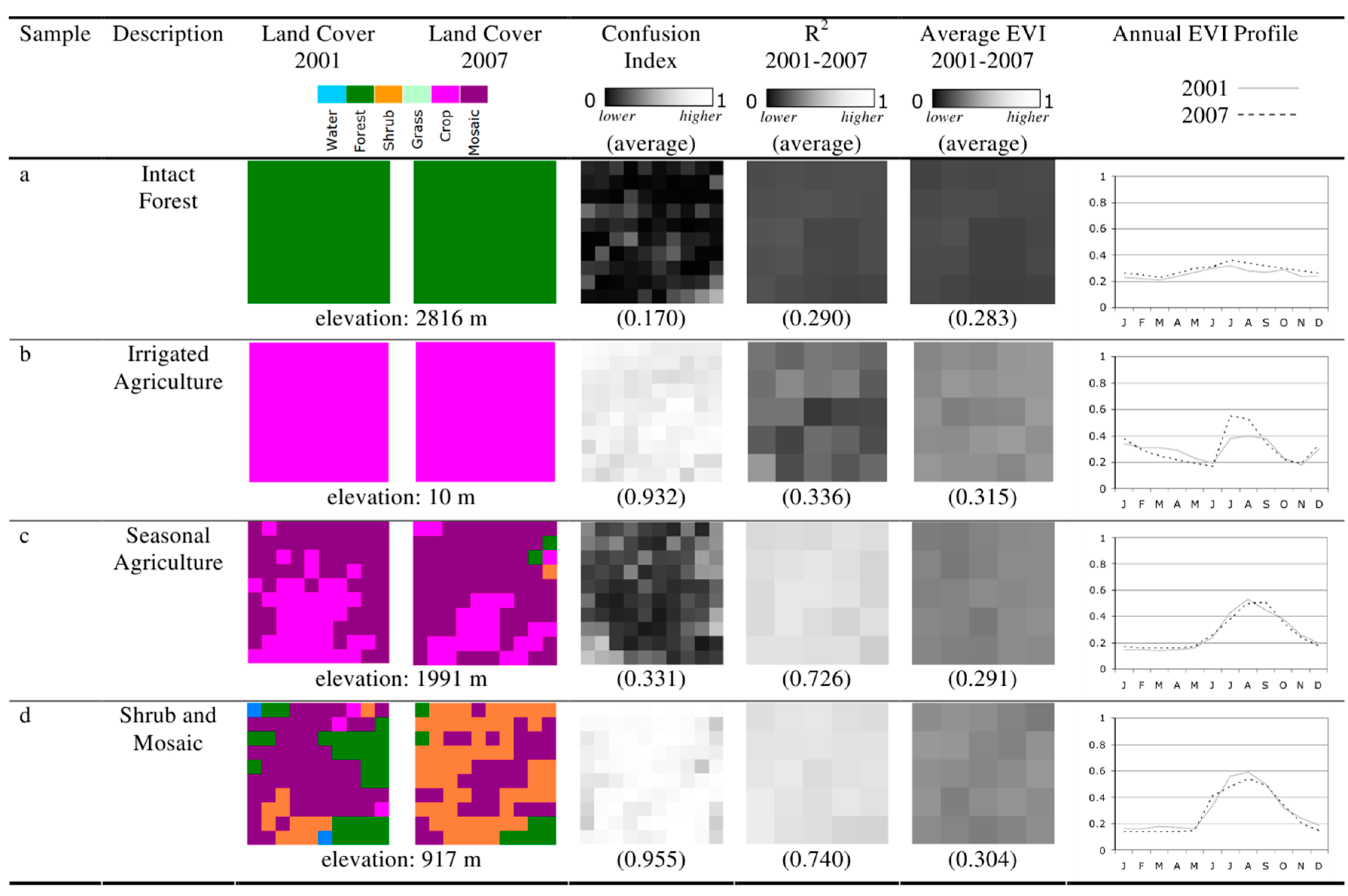 Selected samples of land change scenarios, including land cover 2001 and 2007, Confusion Index, Model Performance, Average EVI, and Annual profiles. (a) Intact forest; (b) Irrigated agriculture; (c) Seasonal agriculture; (d) Shrub and Mosaic.