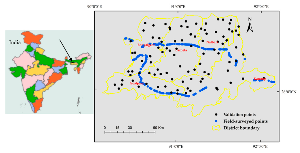 The study area includes five districts (Bongaigaon, Barpeta, Goalpara, Nalbari and Kamrup) of Assam in northeast India, with an area about 14,000 square km. The center of the area is located at 26°23′N and 91°09′E (Figure 1). Assam is mainly the flood plain of two rivers: Brahmaputra and Barak. The region experiences heavy rainfall with an average of 3000 mm annually. Rice, the principal crop of the region, is cultivated during very wet summers, as well as in very dry winters. The area under rice cultivation is 25 million hectares, which is 71% of the total cultivated area [35].