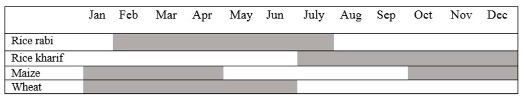 The region has two distinct growing seasons of rice: rabi (February/March–June/July) and kharif (June/July–November/December) (Figure 2). Most farmers prefer to plant kharif rice due to the abundant rain and favorable temperature. Rabi rice is mainly distributed near the river and the lakes to take advantage of the captured or retained water of the monsoon rain or the irrigation infrastructure. The distribution of double-cropped rice is scattered on the north bank of Brahmaputra River, where irrigation is available. The selected study area has all of the rice types, and all were considered for the mapping.