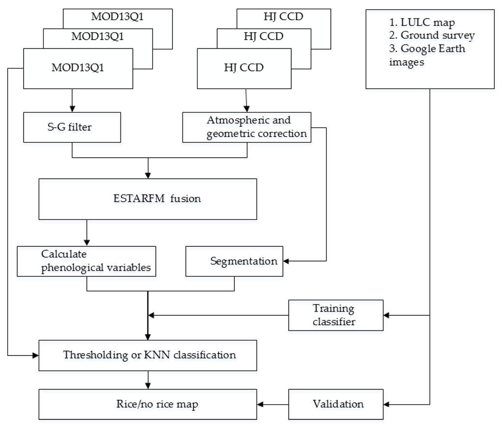 Rice mapping for a large area is generally performed at low spatial resolution due to the insufficient availability of high resolution temporal data [17,19]. To obtain the temporal data at high spatial resolution, image fusion or blending algorithms are commonly applied combing high and low spatial resolution images. The fusion algorithm can predict accurate surface reflectance [30] and has shown the potential of dense time series generation for phenology studies [31].