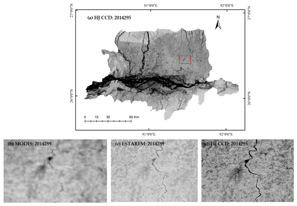 To apply the proposed approach to other climatic regions and large regions, a few points need to be considered carefully, such as the appropriate selection of threshold conditions; parallel processing or cloud-computing is suggested for effective handling of large datasets [71]; and if possible, more high resolution images should be used. Increasing availability of medium and high spatial resolution satellite sensors like SPOT 6, Landsat 8, Sentinel-2 and G-F1 is increasing the observation frequency. An increase in good quality observations would increase the efficiency of the methodology, especially in the tropical regions, where cloud cover is common [72].
