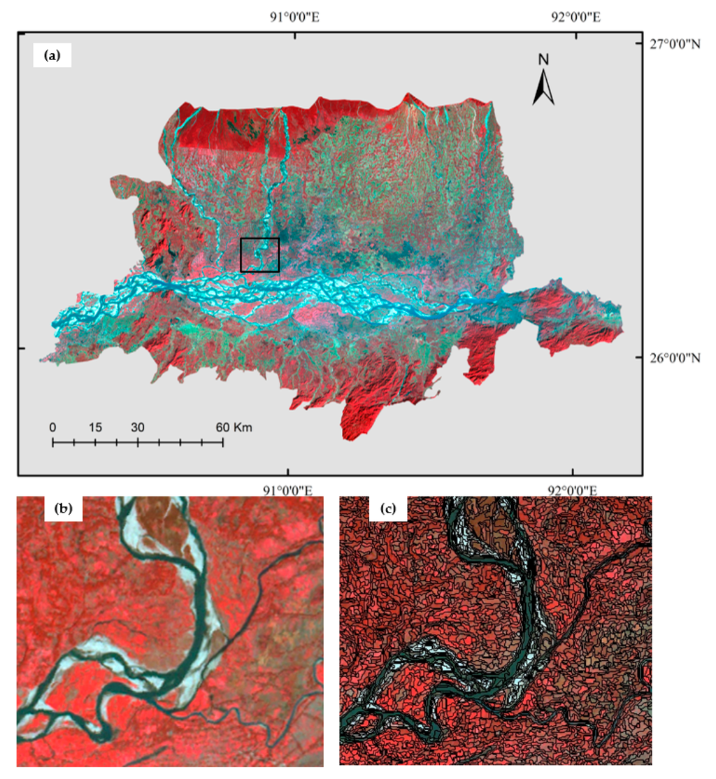 Compared to traditional pixel-based classification, object-based image analysis (OBIA) considers a group of pixels instead of a single pixel for classification [23]. The OBIA produces more meaningful and reliable classification by contributing additional information, including spectral, textural and geometric features [24]. The OBIA includes two steps: image segmentation and classification. In segmentation, the entire image is partitioned into regions or objects that are more internally uniform and homogeneous than neighboring objects [25]. The segmented image generates extra spectral, textural and geometric information of objects. In the classification process, each object is assigned to a specific class according to its spectral, textural, geometric and customized properties. Previous studies have demonstrated the successful use of OBIA in many applications [24,26,27,28]. Small fragmented rice fields are common in India [29]; therefore, the OBIA approach is particularly useful by focusing on objects or parcels instead of concentrating only on the properties of single pixels.