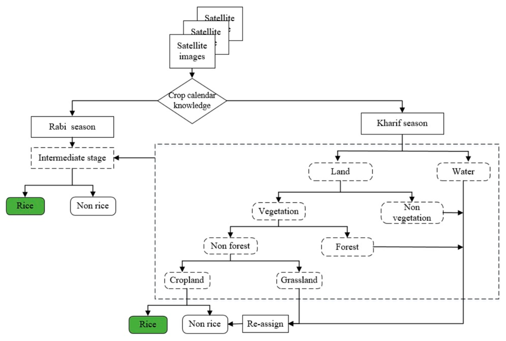 Classification scheme used for rice crop extraction. Doted boxes represent intermediate classes.