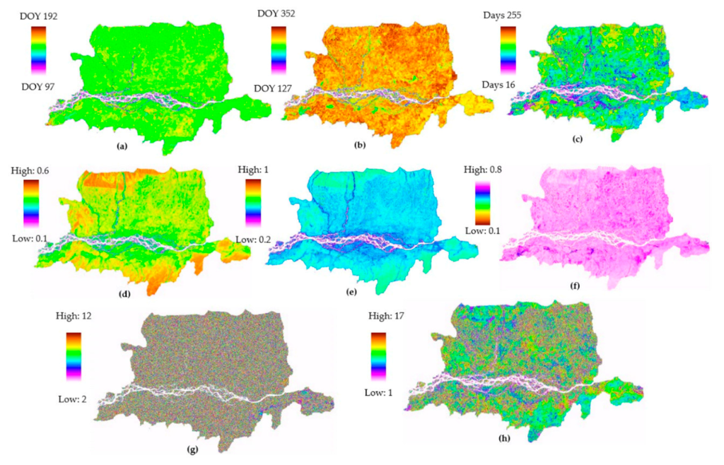 Extracted phenological variables: (a) start of the seasons; (b) end of the season; (c) length of season; (d) base value; (e) largest value; (f) seasonal amplitude; (g) large integral; (h) small integral.