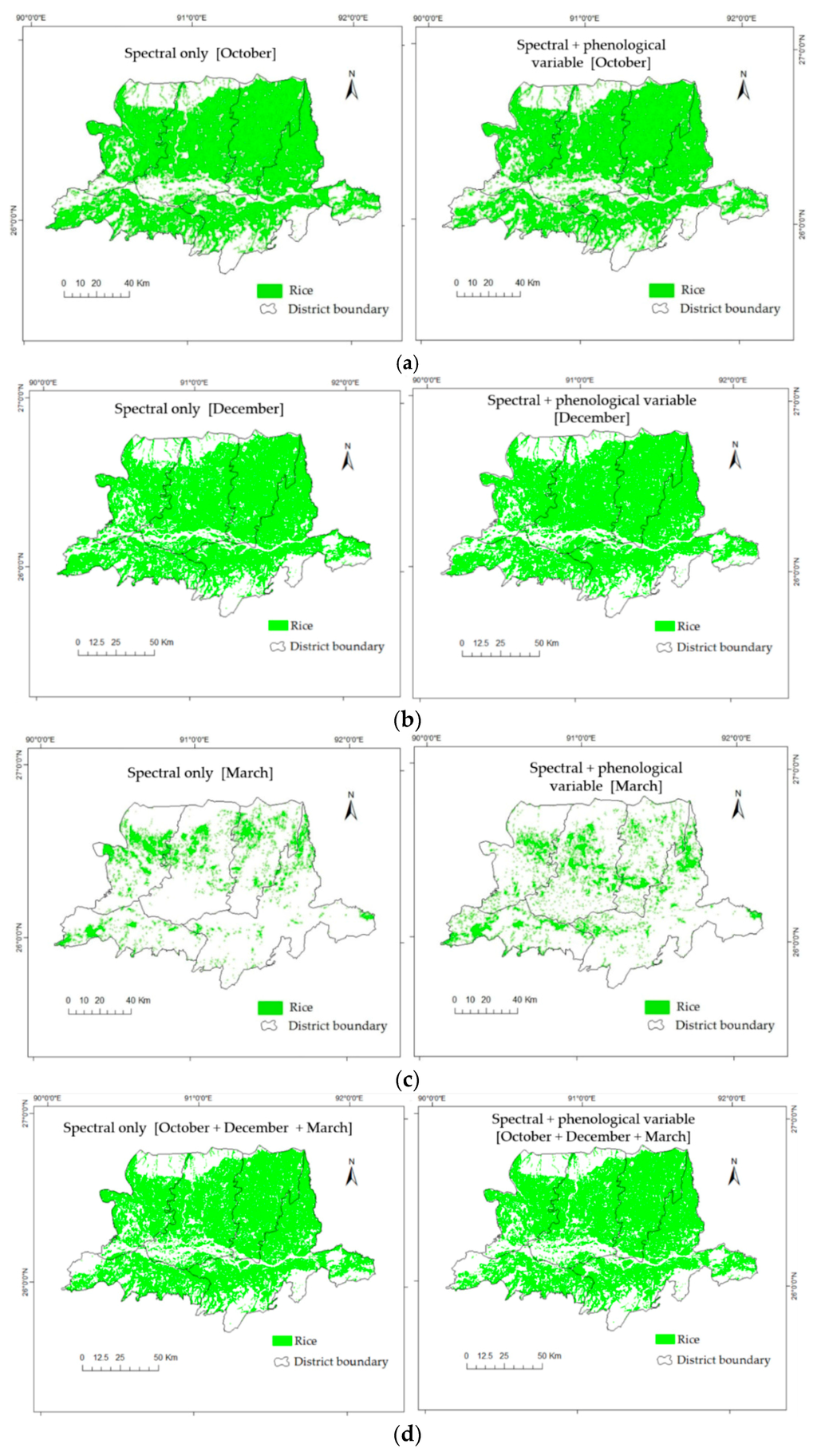The classification was performed for the two approaches: (1) using only the spectral feature and; (2) using both the phenological and spectral features, as shown in Figure 9. In each approach, rice fields were identified effectively. Classification performed with phenology increased the accuracy by 2%–3%. The confusion among grasslands, other crops and rice was minimized by the use of phenology. Using only one image, acquired at the ripening stage of rice (December), provided better results than the image of the heading stage (October). This is because mature ripened rice has typical spectral characteristics. The best classification result with an overall accuracy of 93% was achieved when all three images (October, December and March) were used. The changes of rice canopy structure over time is captured by using more images and increases the spectral separability. Figure 10 show the differences between the spectral and phenology + spectral classification results. It has been observed that the difference lies in the areas where vegetation has similar spectral characteristics, like rice crops.
