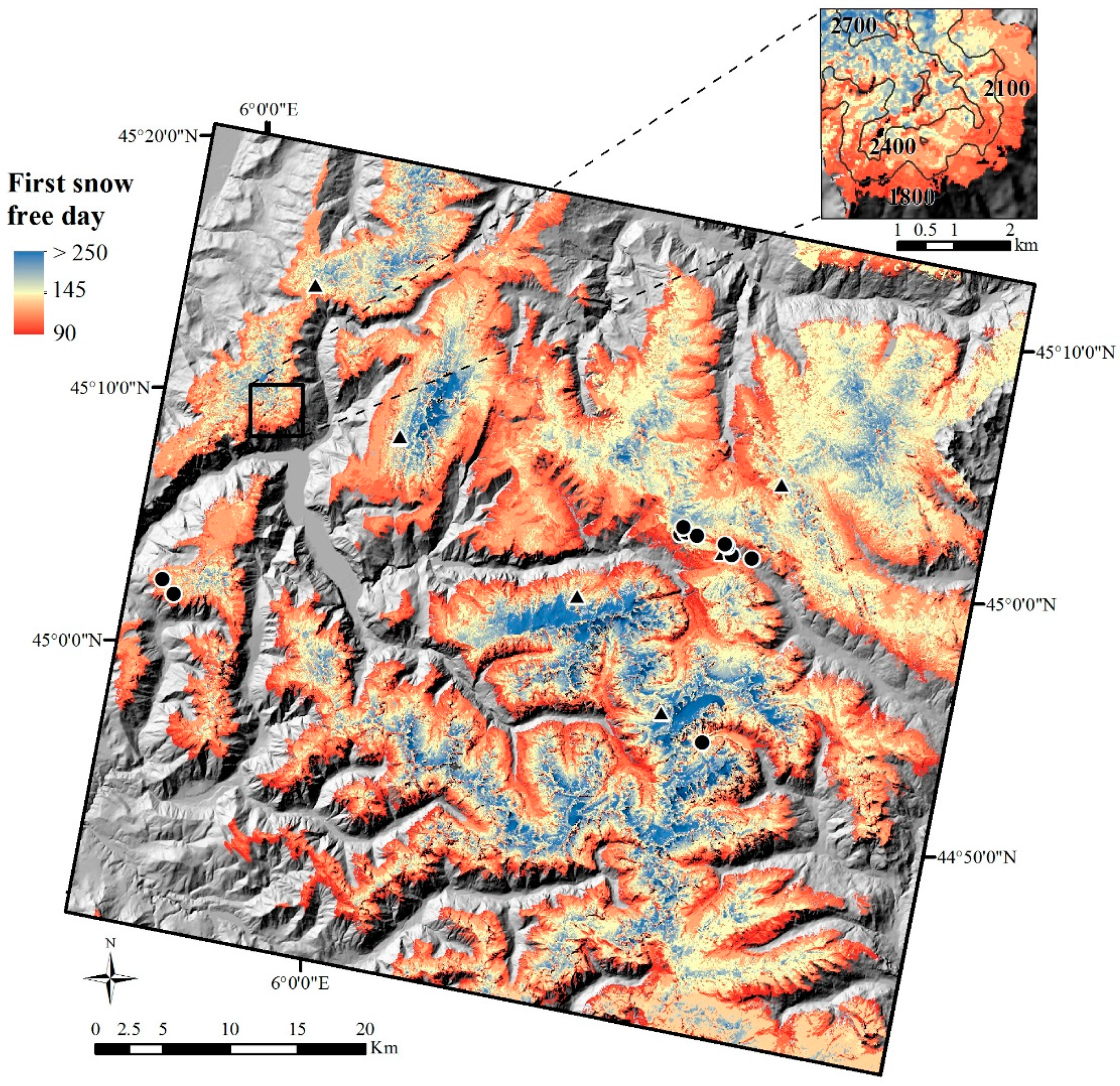 - Dedieu, J.P.; Lessard-Fontaine, A.; Ravazzani, G.; Cremonese, E.; Shalpykova, G.; Beniston, M. Shifting mountain snow patterns in a changing climate from remote sensing retrieval. Sci. Total Environ. J. 2014, 493, 1267–1279. [Google Scholar] [CrossRef] [PubMed]