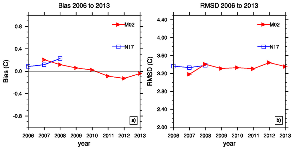 To further assess the HIRS SAT data, it is helpful to break down the assessment to daytime and nighttime SATs. For the simplicity of qualitative analysis, two blocks of 12 h, 0 to 12UTC and 12 to 24UTC, are used to approximate nighttime and daytime over the U.S. Figure 5 displays results of the daytime and nighttime biases and the RMSDs. Figure 5a shows that the nighttime biases of HIRS SAT are negative at −0.5 °C to −1.0 °C for both N17 and M02. The daytime bias is positive at 1.8 °C to 2.0 °C. Figure 5b shows that the N17 and M02 nighttime RMSDs are reasonably consistent for 2006–2013 at around 3.0 °C. The daytime RMSDs for the N17 and M02 are higher than the nighttime RMSDs with values between ~3.6 °C to 4.0 °C from 2006 to 2013. Nighttime observations, in general, provide a more uniform comparison database. During daytime, the uneven heating surrounding the station can further complicate the match-up of a field-of-view measurement from HIRS and a point measurement from a surface station, and these factors may contribute to larger RMSDs.