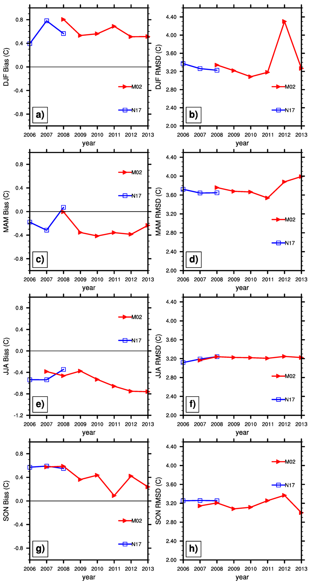 Seasonal mean bias and RMSD of HIRS M02 and N17 SATs (in °C). Bias is defined here as HIRS minus USCRN. Panels (a) and (b) show winter mean bias and RMSD; (c) and (d) show spring mean bias and RMSD; (e) and (f) show summer mean bias and RMSD; and (g) and (h) show fall mean bias and RMSD.
