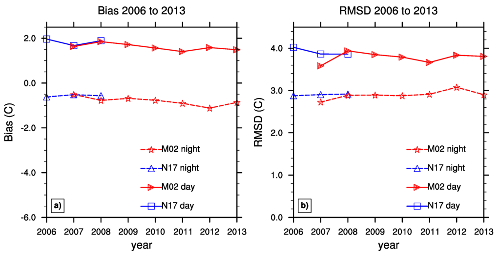 Annual mean bias (a) and RMSD (b) of HIRS M02 and N17 SATs (in °C, both day and night). Bias is defined here as HIRS minus USCRN.