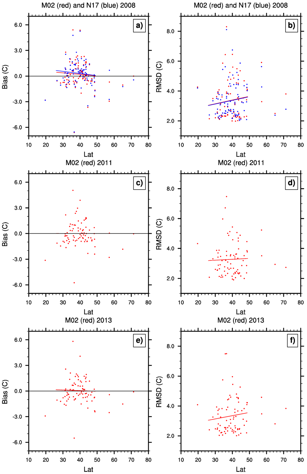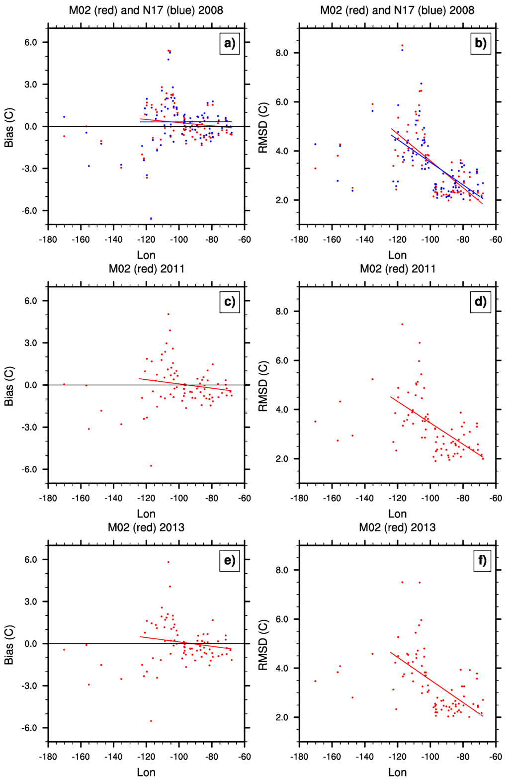 Scatter plots of annual mean bias and RMSD (°C) of HIRS SAT co-located to each USCRN station along longitude for 2008, 2011, and 2013. The bias and RMSD values for the three years are plotted in (a) and (b) for 2008, in (c) and (d) for 2011; and in (e) and (f) for 2013, respectively. Lines represent the least squares fit to the data. N17 data are in blue and M02 data are in red.