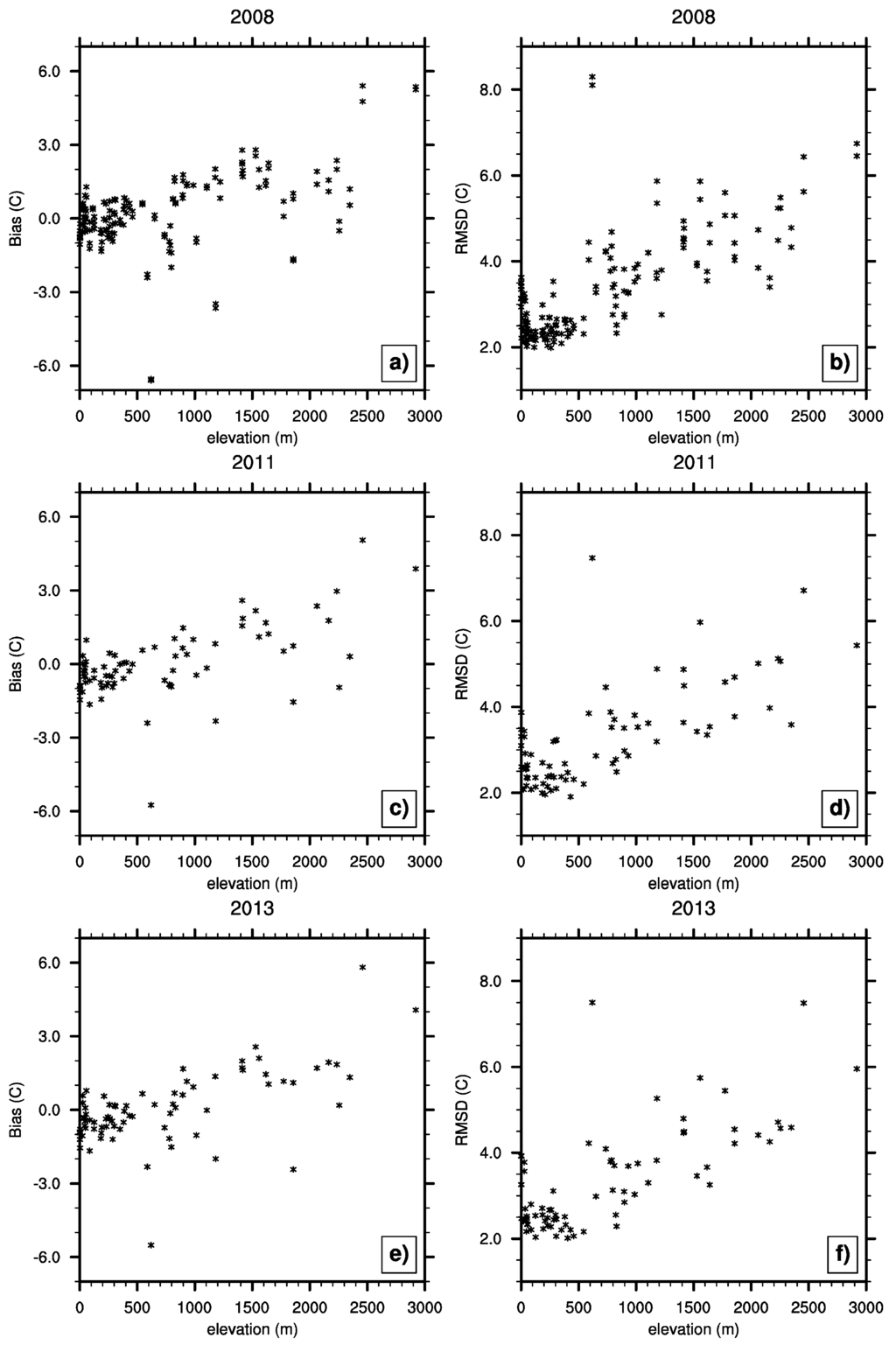 Scatter plots of annual mean bias and RMSD (°C) of HIRS SAT co-located to each USCRN station along elevation (m) for 2008, 2011, and 2013. The bias and RMSD values for the three years are plotted in (a) and (b) for 2008; in (c) and (d) for 2011; and in (e) and (f) for 2013, respectively.