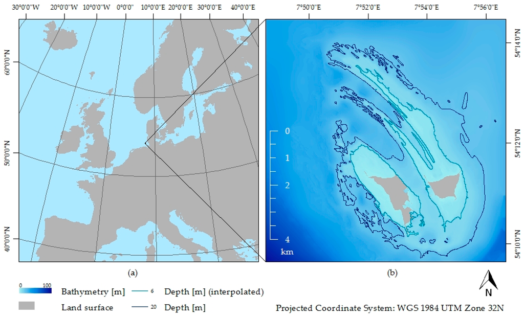 (a) The location of Helgoland is outlined in a map of Europe (data source: openstreetmapdata.com); (b) A bathymetric map based on sea chart level zero (lowest astronomical tide) of the subtidal zone of the archipelago (data source: courtesy of Federal Maritime and Hydrographic Agency of Germany 2010).